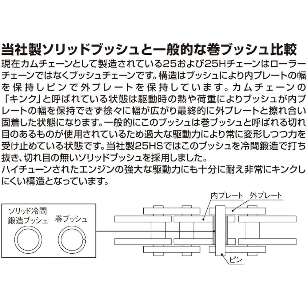 [Application] Reinforced cam chain for motorcycles, 84 links [Compatible with vehicles] Cub 90 CD90 SOLO Daytona DOHC 4-valve head 124.8cc Daytona Dyna head 88cc/110cc [Specification 1] EK chain (manufactured by Enuma Chain Manufacturing) [Specification 2] Kink Solid bush specification that is difficult to bend [Specification 3] 25H size link plate is thicker than the genuine cam chain [Specification 4] The cam chain pin diameter is made thinner to reduce weight, and the pin surface is hardened (CRH/special chromizing treatment) Achieves an exquisite strength balance by applying