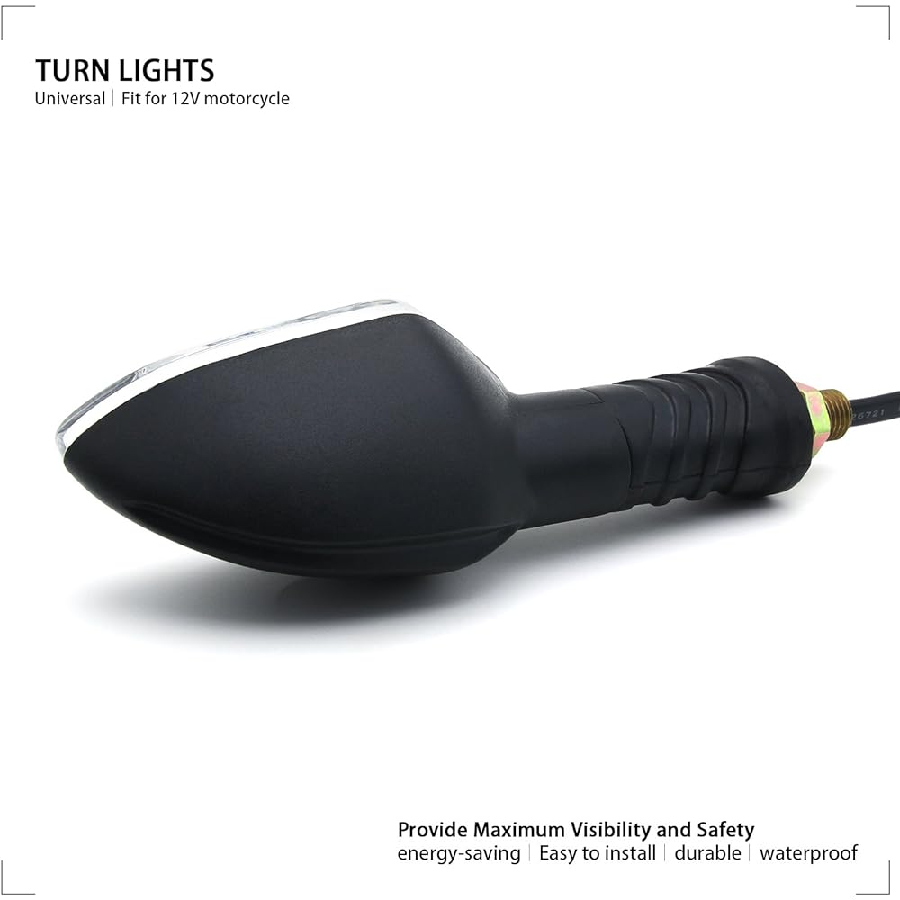 Easy to install, unique design and very bright. Long lasting, long life and energy saving. Each turn signal features 12 bright LEDs and clear lens construction. Turn signals use LEDs instead of regular light bulbs. They last 8 times longer than regular light bulbs, provide more illumination, and consume less energy. When lit, the LED will turn amber. Waterproof and shockproof, stable and durable. Application: Turn signal/indicator light, universal fit for all motorcycles. Material: PMMA+ABS; Cool appearance, black with clear lens.