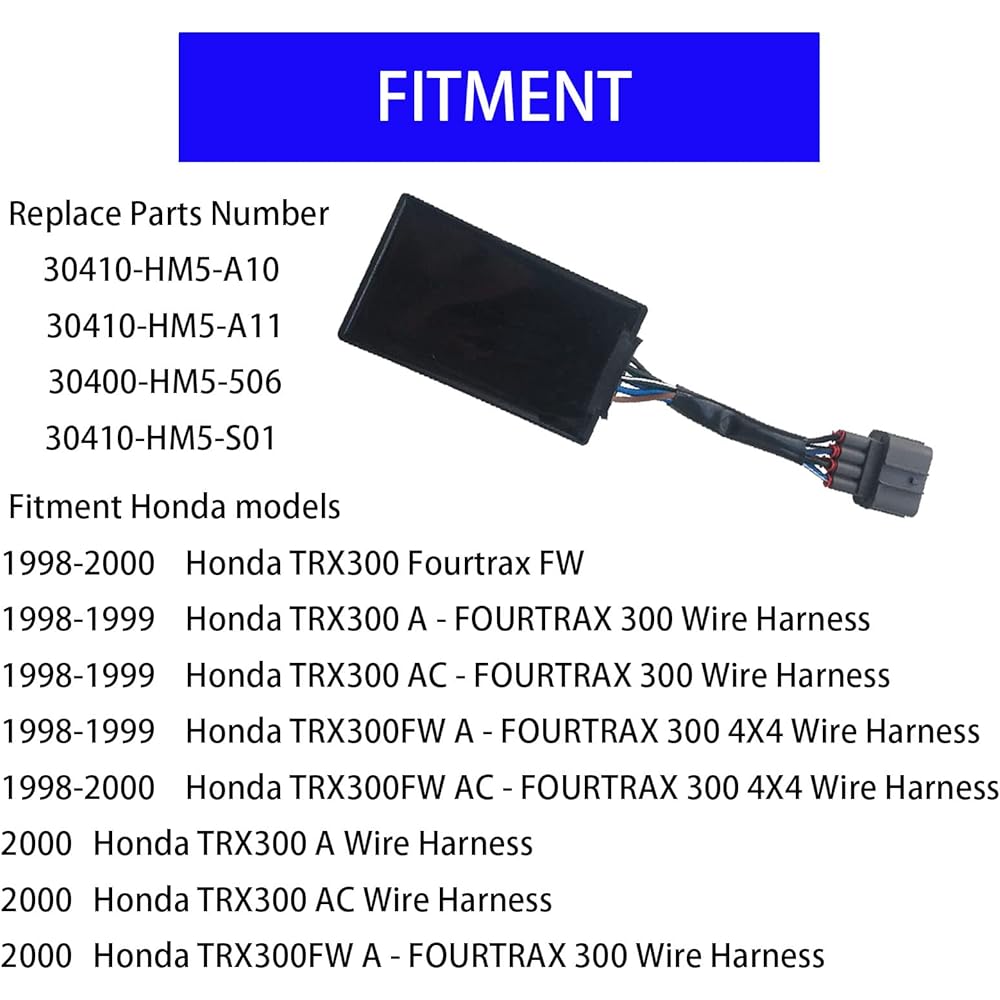 [Fitment] - CDI Igniter Replacement Honda TRX 300 2x4 TRX300 FW 4x4 Fourtrax TRX300FW 1998 1999 2000. [Part Number]- 30410-HM5-A10 30410-HM5-A11 30400-HM5-506 30410-HM5-S01. [Warranty] - 1 Year Warranty [Note] - Please make sure the model number, part number and photo are the same as yours.