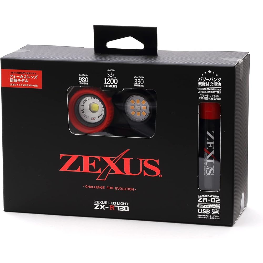 ZEXUS's strongest brightness and functionality. 3rd generation flagship model | Amazing brightness of 1200 lumens (at boost). With the dimming function that adjusts the light intensity and the focus function that adjusts the irradiation angle, you can create the optimal light for any scene. There are 3 light colors: ``white'' for absolute brightness, ``light bulb color'' that has a natural color and is comfortable to work with and move around, and ``red'' that does not alarm fish. It is also equipped with safety features such as rear recognition, which alerts you to the presence of anglers, and an indicator that shows the remaining battery level at a glance. The included rechargeable battery "ZR-02" can power various devices from the USB-C port. Not only can it be used for fishing, but it can also be used as a power bank in emergencies.