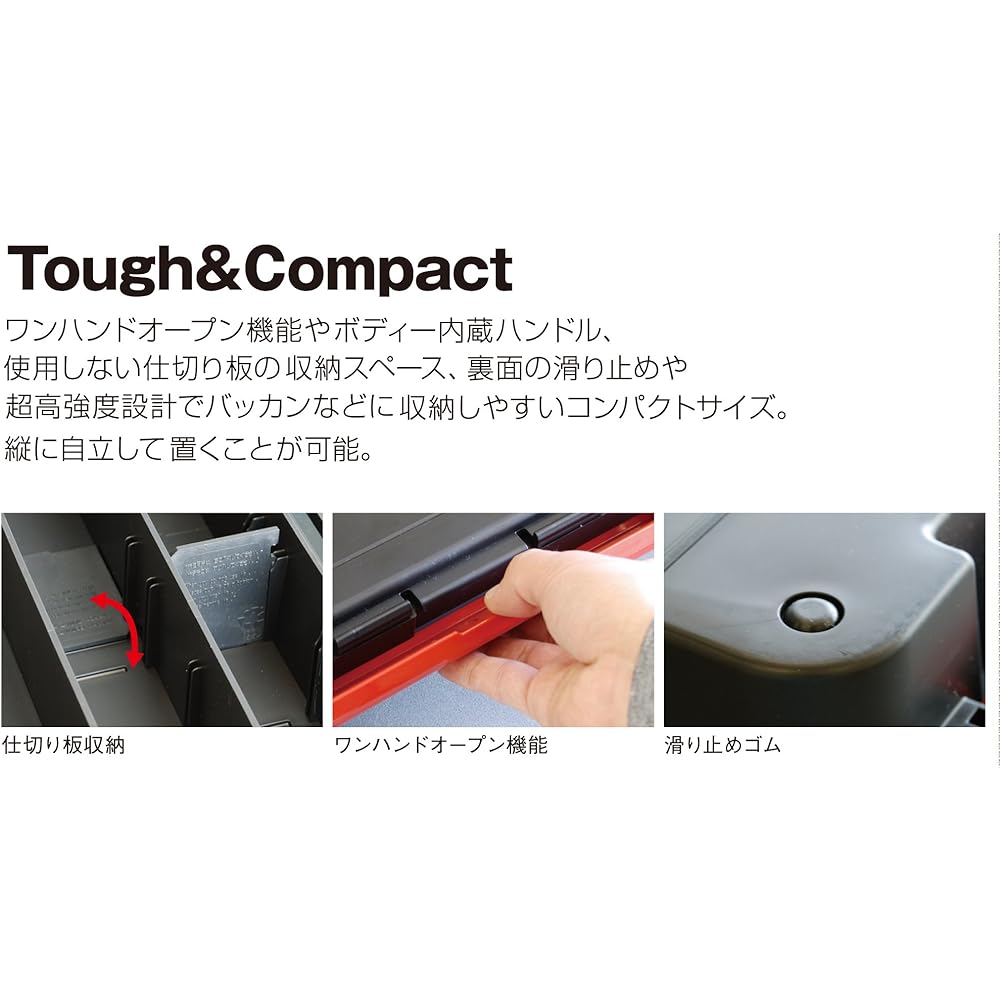 Ultra-high strength design and compact size that is easy to store in bags etc. It is packed with convenient features such as a one-handed open function, a built-in handle, storage space for unused partition plates, and a stopper on the back.