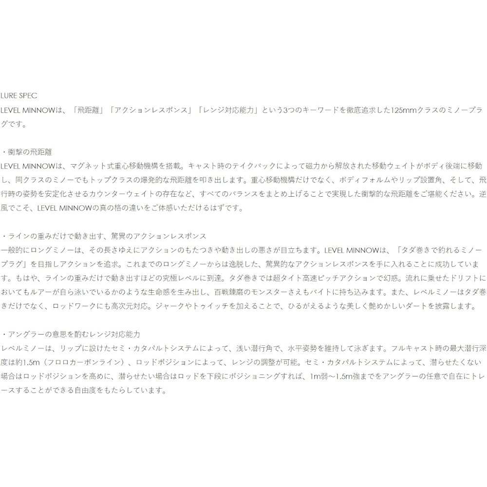 LEVEL MINNOW is a 125mm class minnow plug that thoroughly pursues the three keywords of "flying distance", "action response" and "range compatible ability". ○Impact flight distance LEVEL MINNOW is equipped with a magnetic center of gravity movement mechanism. Due to the take-back during casting, the moving weight is released from the magnetic force and moves to the rear end of the body, resulting in an explosive flight distance that is one of the top minnows in its class. Please enjoy the shocking flight distance achieved by bringing together not only the center of gravity movement mechanism, but also the body form, lip installation angle, and the presence of a counterweight that stabilizes the flight posture. You will be able to experience the true difference of LEVEL MINNOW only when there is a headwind. ○ Incredible action response that starts to move just by the weight of the line Generally speaking, long minnows have noticeable sluggish action and poor movement due to their length. LEVEL MINNOW pursues action with the aim of being a "minnow plug that can be caught for free." We have succeeded in obtaining an amazing action response that deviates from conventional long minnows. It has now reached the ultimate level where it can start moving just by the weight of the line. Free winding will dazzle you with its ultra-tight, high-speed pitch action. Even when drifting with the current, the lure creates a sense of life as if it is swimming by itself, and even the most battle-hardened monsters are brought into bite. In addition, the level minnow is suitable not only for free winding but also for rod work. By adding jerks and twitches, you can create beautiful and lustrous darts that will make you flutter. ○ Range-compatible ability that takes into account the intentions of the angler The Level Minnow uses a semi-catapult system installed on the lip to swim while maintaining a horizontal position at a shallow diving angle. The maximum diving depth at full cast is approximately 1.5m (fluorocarbon line), and the range can be adjusted depending on the rod position. With the semi-catapult system, anglers can freely trace from just under 1m to over 1.5m by positioning the rod higher if they don't want it to dive, or lowering it if they want it to dive. It brings freedom.