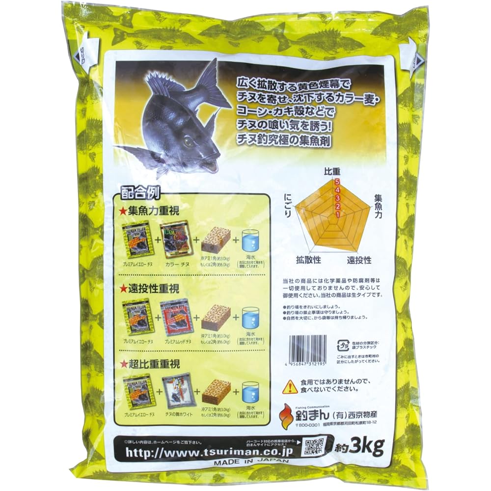 A set of 4 Premium Yellow Black Porgy bags. Each bag contains approximately 3.0 kg. Great for long distance casting! Great for clumping! Great for separation! Great for turbidity! The widely spreading yellow smoke screen attracts black porgy, while the sinking colored wheat, corn, and oyster shells tempt the cautious black porgy to bite. It also pairs perfectly with yellow Nerie. Tsuriman products do not contain any chemicals or preservatives, so you can use them with confidence. This is a raw bait, so please use it as soon as possible.