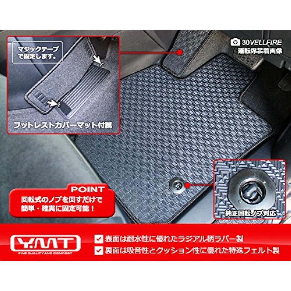 Product composition: Floor mats: 1 car Step mats: 4 pieces Trunk mats (luggage mats): 3 pieces ■Unlike conventional rubber mats, this is a new type of rubber mat that is both solidly thick and lightweight. ! ■By applying felt processing to the back side, we succeeded in reducing the weight while taking advantage of the characteristics of rubber (waterproofing, sound insulation, dirt prevention). ■The rubber mat is durable and very easy to handle. ■Skiing, snowboarding, fishing, baseball, soccer, marine sports, radio control, etc. ■This rubber mat firmly protects the floor from dirt caused by sports, transporting children to and from sports classes, and leisure activities. ■It is made to be tougher than previous floor mats, so it will firmly support the active car life. ■If you use rubber mats and carpet fabric mats depending on the situation, you will not spoil the sense of luxury and cleanliness in your room. ●Points - The surface is textured with a radial pattern for excellent grip.・As it is a water-resistant synthetic rubber, it is effective against water and mud stains.・Back side: Weight: 800g/square meter Thickness: By using high-density felt of approximately 5mm, it has excellent cushioning properties and sound absorption properties that reduce road noise.・The felt on the back side is specially treated with acrylic resin to prevent it from slipping when worn. Precautions for use *Please note: - This product is a Velcro type step mat fixing method. - If it gets dirty, the surface of the rubber mat can be washed or wiped with water, but please do not splash water on the felt part on the back. (If the felt part gets completely wet, it will take a long time to dry.) Caution (Disclaimer) > Please read *Please note: - This product is a Velcro type step mat fixing method. - If it gets dirty, the surface of the rubber mat can be washed or wiped with water, but please do not splash water on the felt part on the back. (If the felt part gets completely wet, it will take time to dry.) Read more