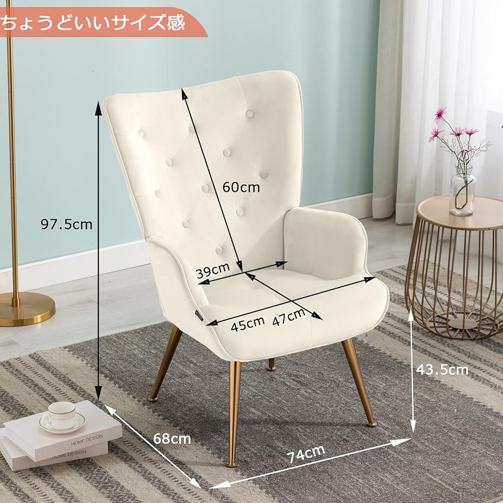 🐇Stylish Scandinavian design: Soft velvet fabric seat combined with gold legs. The beautiful, luxurious, and casual Scandinavian style gives you a sense of gentleness and luxury. 🐇Wide high back design: The backrest is high and has a high back design that covers your head. It feels like it completely hugs your body, making it very comfortable to sit for long periods of time without losing your posture. Since you can rest your whole body on it, it is a comfortable design that reduces strain on your shoulders and neck even if you sit for long periods of time. 🐇Comfortable and relaxing chair: The backrest has an appropriate inclination angle so that you can naturally relax when sitting. It maintains a naturally relaxed and comfortable posture, making you comfortable even when sitting for long periods of time. 🐇Easy to stand and sit: Single chair with cushioned armrests on the sides. It gently supports your elbows and makes it easy to stand up, making it ideal for elderly people and people with leg and back problems. 🐇 Easy-to-use high-back chair that makes daily movements easier: The wide seat and high back make everyday movements such as watching a PC, watching TV, and taking a nap easier and more free, making it ideal for elderly people, pregnant people, and those who are worried about their legs and back. Recommended for some people. It can be used by a variety of people regardless of their physique or age.