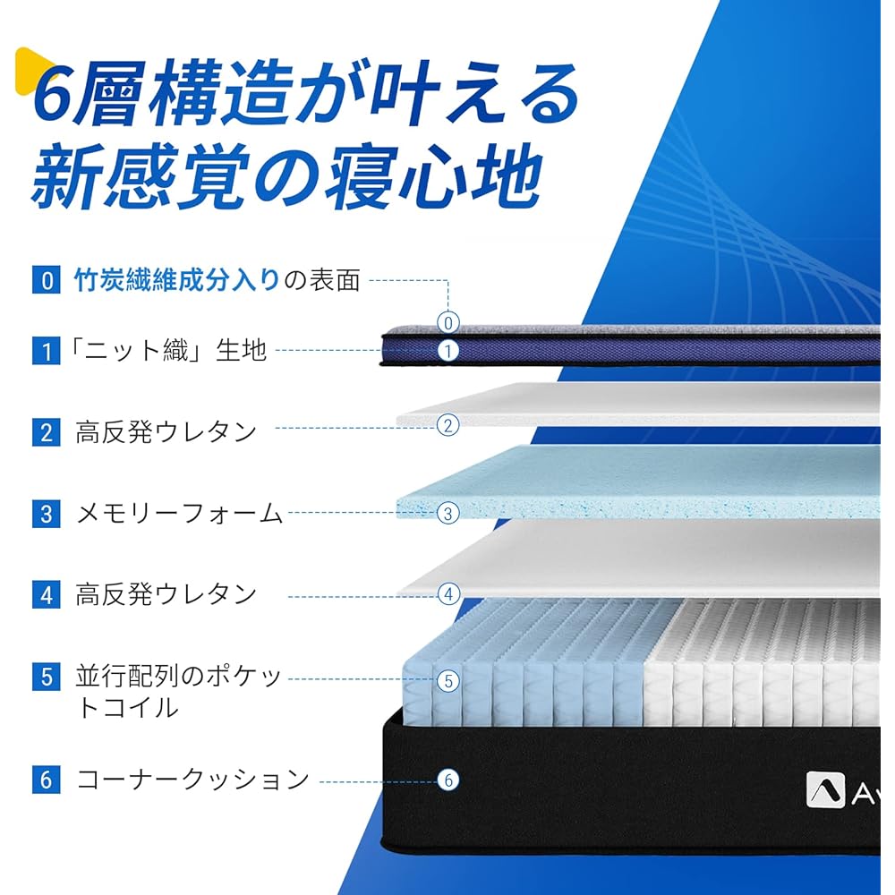 [High resilience, but slightly soft to soft mattress] ``I want something soft, but with low resilience and non-coil, my lower back sinks in so much that it's hard to sleep,.'', ``My lower back is heavy and I continue to lack sleep.'' Based on customer feedback such as ``I sleep on my side a lot, I like something a little softer,.'', Avenco created the ``Dream Sound'' mattress series with ``High Resilience Urethane'' that is softer than conventional products. Ta. It has a comfortable, enveloping fit and excellent body pressure dispersion, and it puts less pressure on the areas it touches, helping to prevent lack of sleep due to frequent tossing and turning. Furthermore, it uses two layers of high-resilience urethane to prevent your lower back from sinking too much, making this mattress both resilient and soft. [Create your sleeping environment and get a good night's sleep] Avenco's single pocket coil mattress has an ergonomic 3-zone structure that divides your body into 3 layers, reducing the burden on your hips, shoulders, and back. The thick 2.2mm coil provides firm support, giving you a sense of security, while the thin 2.0mm coil provides gentle support, increasing the fit of your body. This mattress is both "soft" and "improves the burden on the body." [Partner for Comfortable Sleep] Made of gel-infused memory foam material, this bedding not only has the ability to memorize your sleeping position, but also regulates your temperature while you sleep, keeping you cool in the summer and warm in the winter. In addition, memory foam has a porous structure that allows for high air permeability, which prevents mold and dust mites from forming on the single bed mattress, and prevents moisture from accumulating inside, ensuring a refreshing night's sleep. . [Anti-sinking, multi-layered foam] In order to increase the comfort of your body, we have added a layer of high-resilience foam under the knitted surface layer, giving you just the right amount of elasticity when you lie down. On top of the coil layer, an extra layer of high-resilience foam is added to provide the user with a fluffy and chewy sleeping experience that feels like being on a cloud. Another characteristic of high resilience foam is that it can expand quickly even when compressed for long periods of time. [Designed with durability in mind] Konan cushions are placed in the squares of the Avenco high resilience mattress to prevent it from losing its shape. The coils inside are wrapped in non-woven fabric, which prevents the coils from directly interfering with each other, reducing creaking noises. In addition, the coil itself has been heat treated to make it more durable and rust-resistant. [Safety Guarantee from Avenco] Our products are produced in a factory that meets the international standard ISO900, and are certified by CertiPUR-US and Oeko-Tex. We guarantee the quality, so you can use it with confidence. The single mattress 97cm x 195cm x 25cm will arrive compressed and please wait a week for it to fully expand.