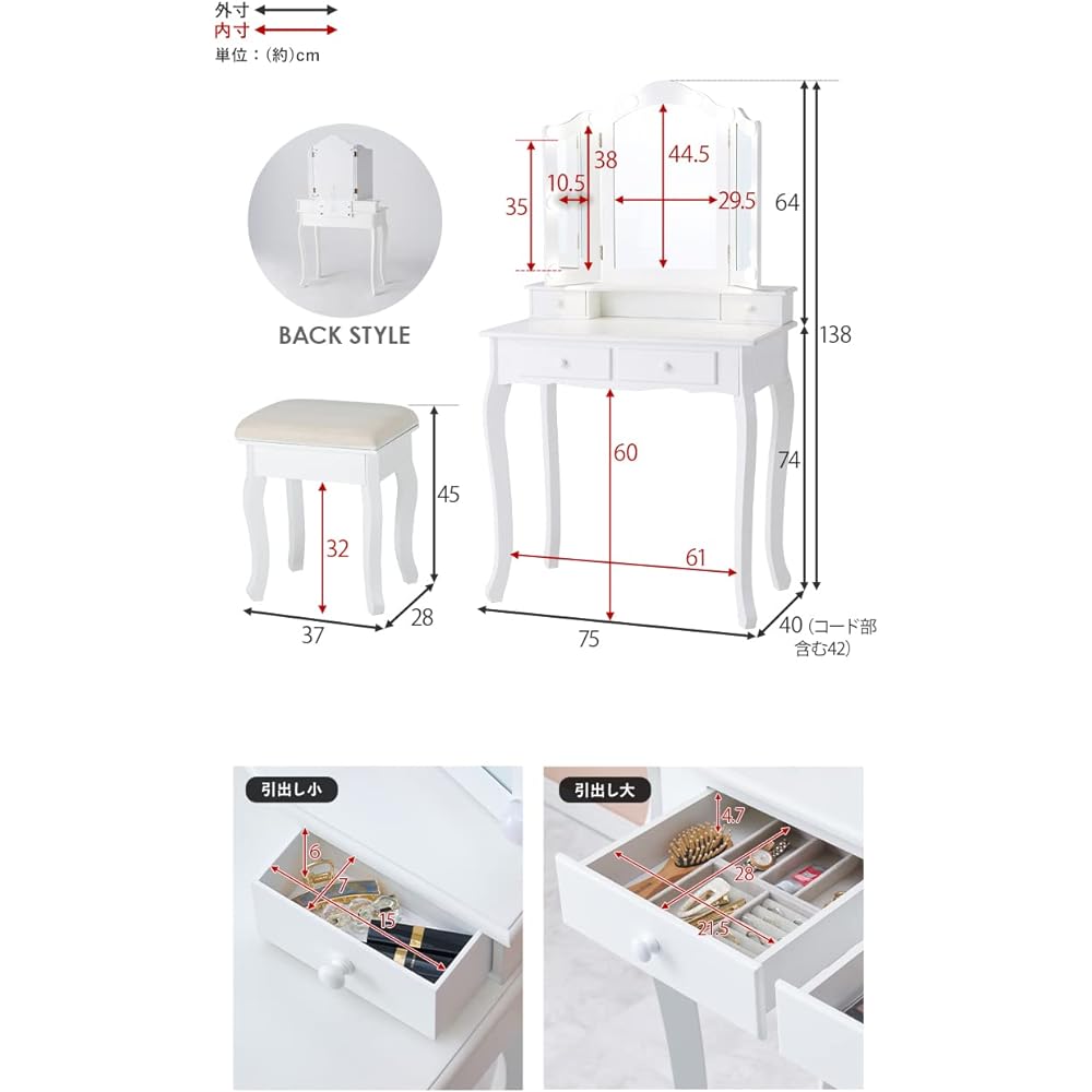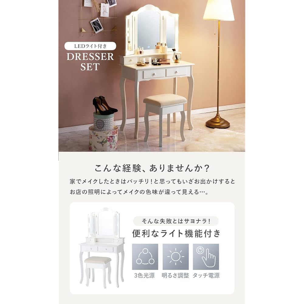 [Product size (approx.)] Dresser: Width 75 x Depth 42 x Height 138 cm / Stool: Width 37 x Depth 28 x Height 45 cm [Actress dresser that will make you feel good]: An elegant dresser with delicate curves that stand out. A three-way mirror that allows you to check your makeup and hairstyle from various angles. The mirrors on both sides can be fixed at any angle you like. [Easy touch-type light adjustment]: The touch-type switch in the center of the mirror allows you to adjust the light color (warm color, natural light, cool color) and brightness (stepless). You can simulate the light according to your TPO, so you can go out with more confidence in your makeup. [Comes with a nice stool]: The set includes a simple and calming colored stool made of elegant velor fabric. It has just the right amount of cushioning and is comfortable to sit on.