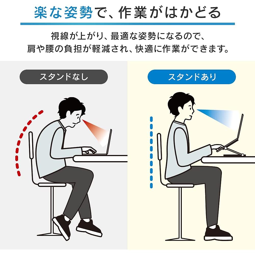 This is a PC stand whose height and angle can be adjusted steplessly. A sophisticated and simple design with a sturdy base and arm that prevents shaking and allows for stable work. In addition, the back of the top plate and pedestal are anti-slip to prevent it from falling or slipping. It is compatible with 13-17 inch laptops and tablets, and is also recommended for those using larger PCs. The large vents on the back of the top plate prevent heat from building up and improve the performance of your computer.