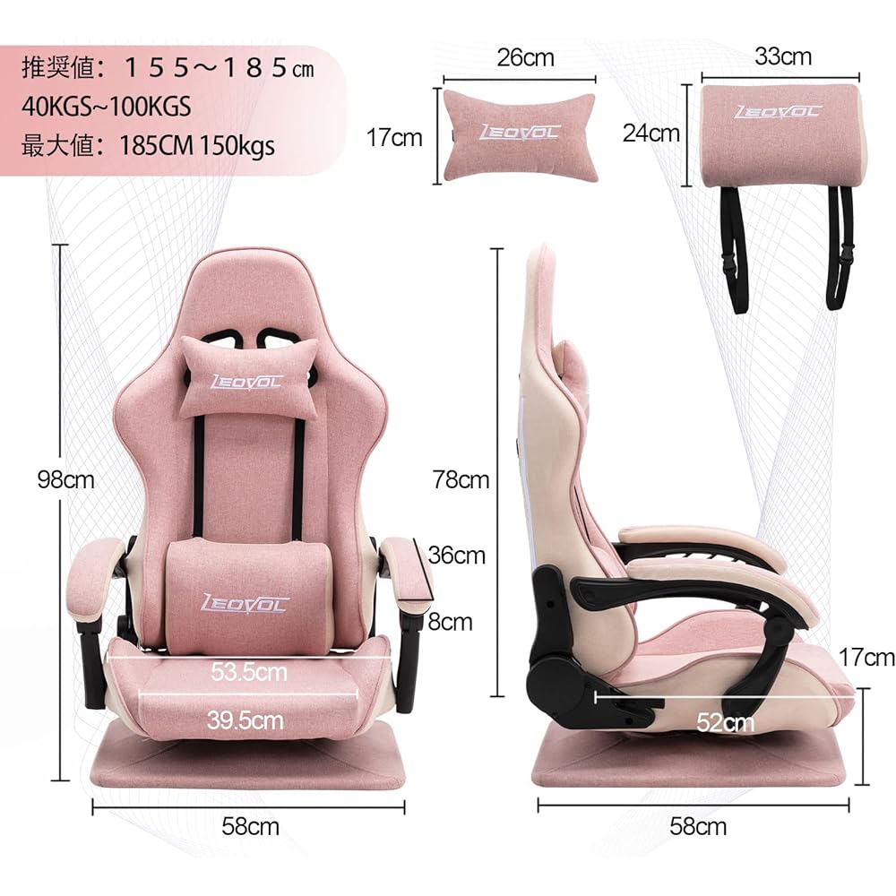 ``Functionality unique to the material and good durability!Fabric gaming chair chair'' The fabric material has good breathability and does not get stuffy, so it maintains a high level of comfort even in the stuffy environment of the hot summer, and even in the winter. It is not cold and maintains a comfortable sitting comfort regardless of the season. In addition, fabric materials are not affected by humidity or temperature, so there is less damage due to deterioration and the surface will not fall apart or peel off. Overall, these gaming chairs have excellent features such as comfort, appearance, and comfort, making them ideal for long hours of desk work. ``A gaming chair with a design that blends in with your interior'' This is a gaming chair that has never been seen before, with the characteristics of a gaming chair that won't cause you to get tired even when sitting for long periods of time, and a design that blends seamlessly into your home's interior! Made of sophisticated fabric, the stylish color scheme does not disrupt the calm atmosphere of the space, making it a great balance for a variety of home environments. The traditional gaming chair design has been completely reimagined to meet a variety of needs, including home, office, gaming, and rest, making it a chair that fits any occasion. The head pillow and lumbar support that come with the ergonomic PC gaming chair firmly support your head and lower back, allowing you to maintain a consistent posture and concentrate on your work. The bone-shaped high back design fits your neck and lower back, making it a chair that won't make you tired even when you sit for a long time. You can adjust it to your desired angle by operating the lever while sitting, and it has a stepless reclining function. When reclining, it features an advanced armrest that moves to match the angle of the backrest, providing firm support for your elbows. The ability to rotate 360° increases convenience and makes this chair perfect for both Western and Japanese rooms. "Easy to assemble & multi-functional gaming chair/seat chair" Easy to assemble, special tools and Japanese instructions are included. Easy to assemble and can be installed in about 20 minutes. Gaming chairs are designed with more functionality in mind than regular chairs, and their appeal is that they make it easier to maintain the correct sitting posture. Your body won't get tired even if you play the game in the same position for a long time, so you can enjoy the game comfortably. It provides an excellent user experience, and can be used not only as a regular chair, but also in studios, bachelor dormitories, and rooms with small spaces. "Factory Direct Sales & One Year Certification" Product Specifications ⇒ Size: Width 58 x Depth 66 x Height 99cm Seat height: 17cm Load capacity 150kg. Special tools and Japanese assembly manual are included, so if you have any questions, please feel free to contact our 7*24 hour service team. The products you purchase come with a one-year free parts replacement warranty. Spare parts are always kept in stock at our Japanese warehouses (Chiba, Osaka), and substitute parts can be delivered the next day at the earliest. You can use it with confidence.