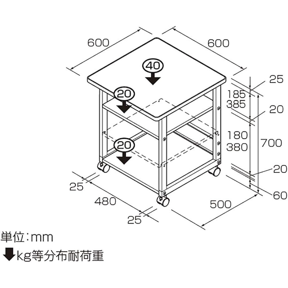 Manufacturer model number: PTL-201N Body dimensions: W600 x D600 x H700mm Material: Top plate/wooden melamine decorative board, body/ Shelf board/Steel melamine baked paint kg equally distributed load capacity: Top board/40, shelf board/20 Height adjustable shelf board, with locking casters