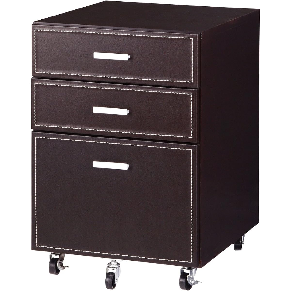 Size: Width 42 x Depth 48 x Height 60.8 cm Drawer internal dimensions (small): Width 33 x Depth 37 x Height 6.4 cm Drawer internal dimensions (large): Width 33 x Depth 37 x Height 16.3 cm [ Materials] Body: MDF, particle board, synthetic leather / Handle: Aluminum / Casters: Nylon resin Product specifications: With casters (2 front stoppers included), finished product Load capacity: Top plate 30kg, small drawer 5kg, large drawer 12kg Brown A desk chest with an elegant leather texture. Perfect for a chic and modern adult atmosphere. The color is just right for a calm room, and it is also recommended for adult rooms and stylish workplaces. There are stoppers on the front two casters.