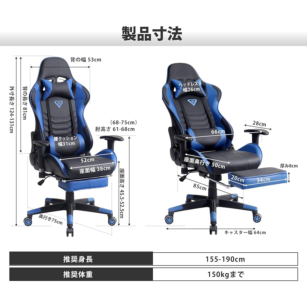 [Product specifications] Size: Width 66 x Depth 75 x Height 124cm Body weight: Approx. 19kg Upholstery: PVC [For professional gamers] The body frame uses a high-class sports car seat frame, giving you the exhilaration of a sports car-style seat . Get even closer to the immersive feeling of gaming. In addition, the sturdy structure and durability unique to sports car frames ensure long-term use. [Backrest adjustment function] Can be reclined 180 degrees, allowing you to relax while sitting in the chair. The backrest can be easily adjusted with a single lever, providing optimal support according to changes in work and gaming postures and physical differences. Perfect for office breaks and naps. [Computer chair that won't make you tired even after sitting for a long time] This gaming chair is made of high-resilience urethane that is not too soft or too hard, and the bionic curved backrest and lumbar cushion can protect your lumbar vertebrae. It relieves pressure on your lower back, making it less tiring even if you sit all day. The fabric is made of stain-resistant PVC leather. Even if there are water drops, you can easily clean it by simply wiping it. [Fully equipped] Fully equipped gaming chair, 2D elbows (up and down, right and left movable elbows), extendable leg rest, and reclining function. Latest nylon base and silent casters, lightweight and rust-free. SGS certified gas cylinder, safe and secure. Weight capacity: 150kg. [One year warranty]