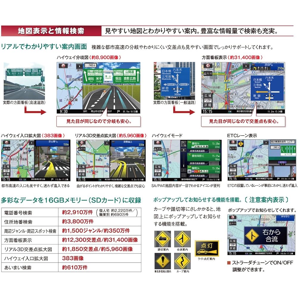 Easy-to-read maps and easy-to-understand guidance. It has a rich amount of information and is easy to search. [VICS WIDE] Guidance on routes to avoid traffic jams without the need for beacons or communication devices. [Strada] You can tune it to your liking and make detailed settings. [Smartphone cooperation] Search and route from the latest information using a dedicated app. [CarAV remote] You can use your smartphone as a remote control.