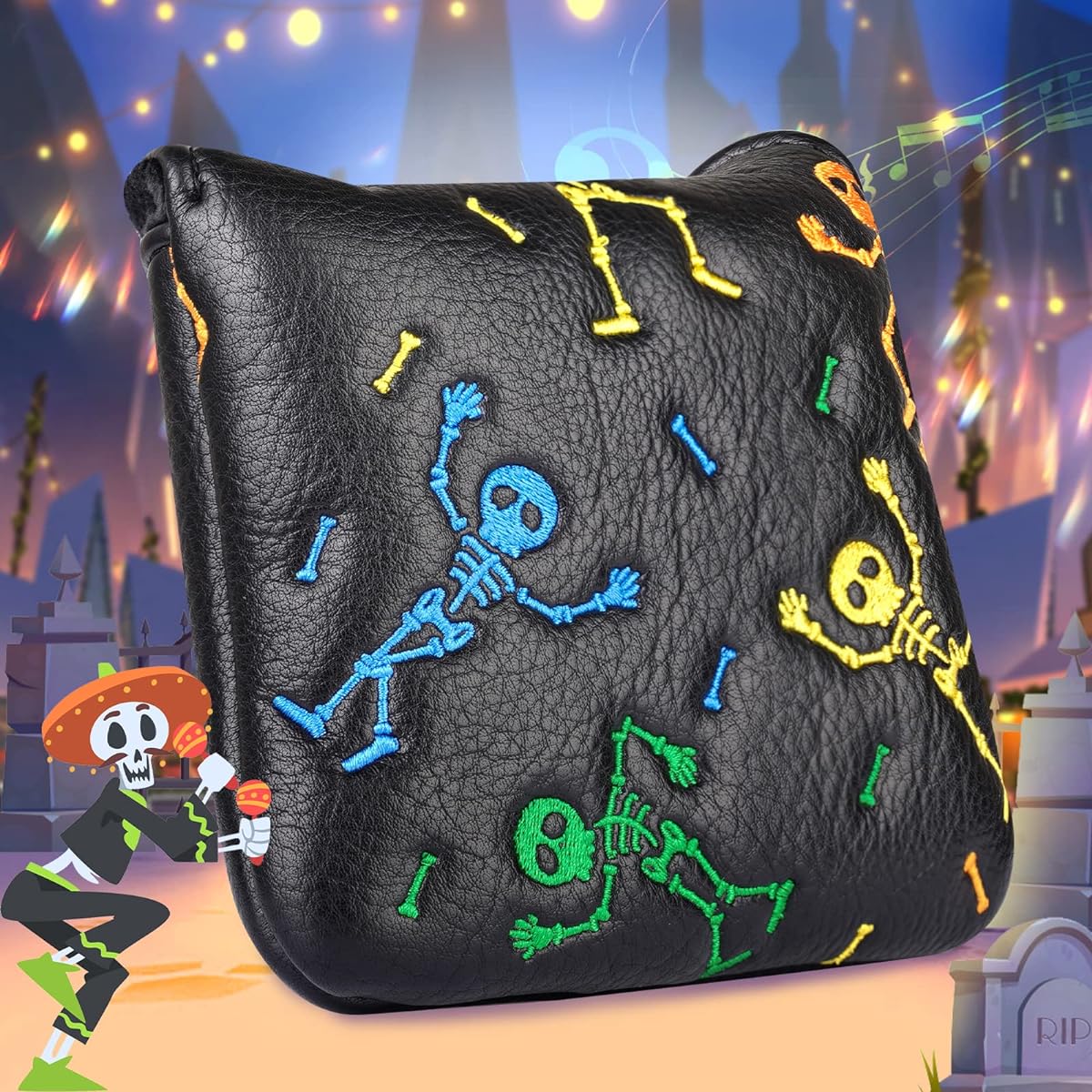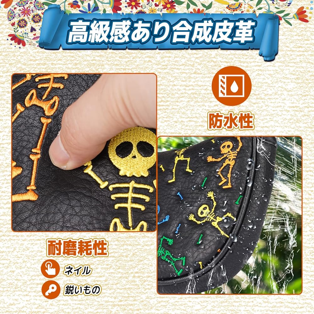 [Applicable model] Compatible with mallet putters such as Odyssey's WHITE HOT 7/ TANK /WHITE HOT 2-BALL. [Magnetic opening/closing] Strong magnetic opening/closing makes it convenient to put in and take out, and won't fall off easily. [High-quality front and back materials] The outer material is made of luxurious PU leather, which has higher abrasion resistance and waterproofness than other materials. The lining is made of soft polyester boa material and is thick enough that it will not get damaged no matter how much you put it in and out. Protect your precious club head from scratches and dirt. [Stylish Embroidery] Skulls are dancing and enjoying the festival. [Exquisite Crafts] Sturdy sewing crafts, no need to worry about ripping from the seams.