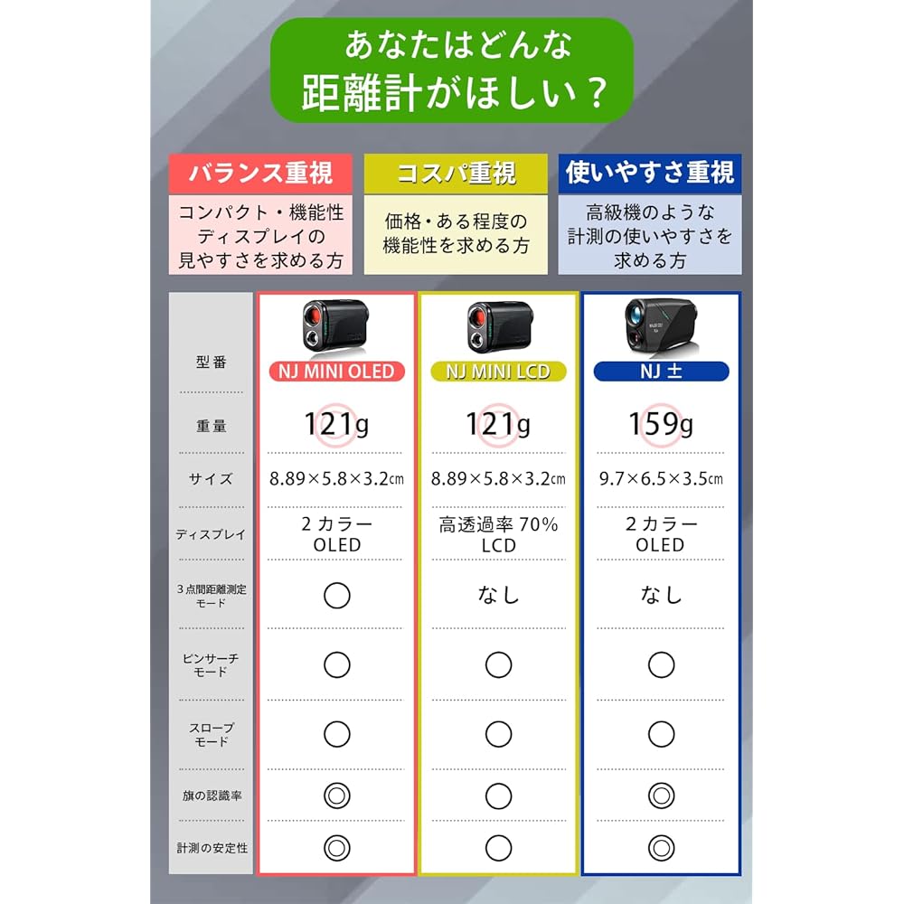 [NINJOR GOLF The most compact and lightweight rangefinder in history] NJ MINI OLED (with 3-point distance measurement mode) [Ultra compact size golf rangefinder] Size: 8.89 cm x 5.8 cm x 3.2 cm ( 89*58*32)/Weight 121g [2-color OLED] The screen is clear and the 2-color notation greatly improves visibility! [Fast measurement speed] Short press 0.1 seconds, long press 0.1 seconds (measurement speed considering stability x measurement speed x algorithm) [Pursuit of stability in accuracy] NJ MINI OLED has a unique algorithm x measurement speed x flag recognition Stability is improved by improving one of the biggest complaints, which is the recognition of flags and the variation in values each time you measure.[Types of MODEs] ① Normal mode ② Slope mode ③ 3-point distance measurement mode Note : Pin search function is activated by long pressing in any mode [Charging] Charging type → Type C cable Can be irradiated 5000 times on full charge (may vary depending on usage and environment)