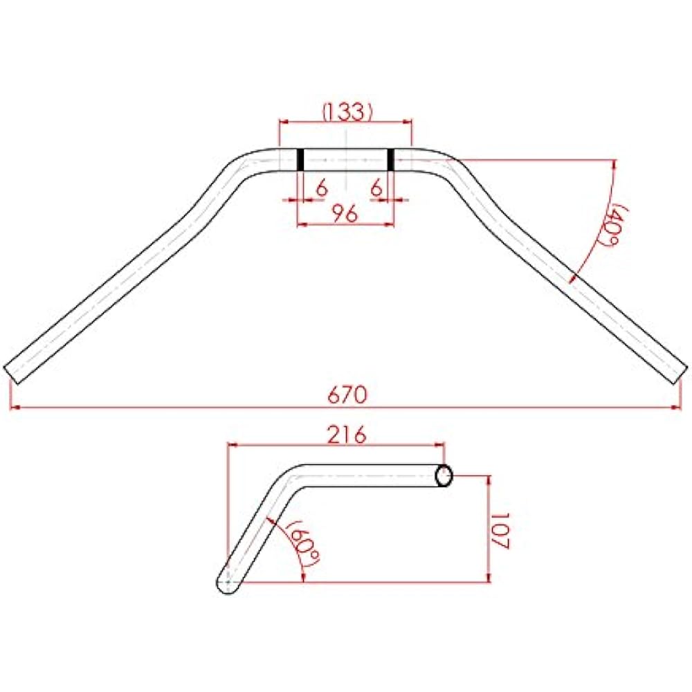 Compatible models: General purpose (general purpose handlebar) EFFEX Super Bar Daytona Type-6 Material: Steel, Color (Surface treatment): Black plating Specifications: Width 670 x Height 107 x Depth (pull) 216 mm, Aperture angle 40 degrees × Standing angle 60 degrees, outer diameter Φ22.2, inner diameter Φ18