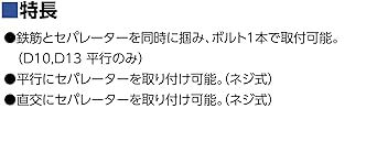 Separator and reinforcing bar can be grasped at the same time and installed with one bolt. Separators can be installed in parallel or perpendicular directions. Applicable reinforcing bar diameter: D10~D16 For W5/16 separators.
