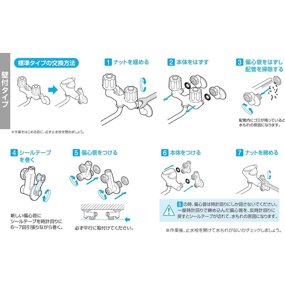 Enlarged view of the upward-facing pipe The upward-facing pipe allows for a spacious sink, making it convenient for installing a water purifier. Increased height compared to standard type. Improved usability in a variety of situations For example, when refilling a kettle or water bottle, or pouring water into a large pot, if the sink is too close, it may hit the pipe, making it inconvenient. Such inconvenience will also be resolved. The entire mixed faucet is plated, giving it a more luxurious look. Replacement method 1 Enlarged view Replacement method 1 Close the water stop valve, make sure the water has completely stopped, and then loosen the nut. Replacement method 2 Enlarged viewReplacement method 2 Remove the main body of the old mixing faucet. Replacement method 3 Enlarged viewReplacement method 3 Remove the old eccentric tube by turning it counterclockwise. Clean the pipe ports with a brush, etc., as sealing tape or dirt remaining inside the pipes may cause water leakage. Replacement method 4 Enlarged viewReplacement method 4 Wrap sealing tape around the new eccentric tube. Wrap the sealing tape clockwise around the screw about 6 to 7 times, pulling it slightly. Replacement method 5 Enlarged view Replacement method 5 Attach the eccentric tube by screwing it in clockwise. When installing the eccentric tube, please only turn the eccentric tube clockwise. If you turn it counterclockwise, it may cause water leakage, so try again. Replacement method 6 Enlarged view Replacement method 6 Attach the main body and tighten the nut with a spanner, etc. After installation, open the water stop valve and if there is no water leakage, the installation is complete.
