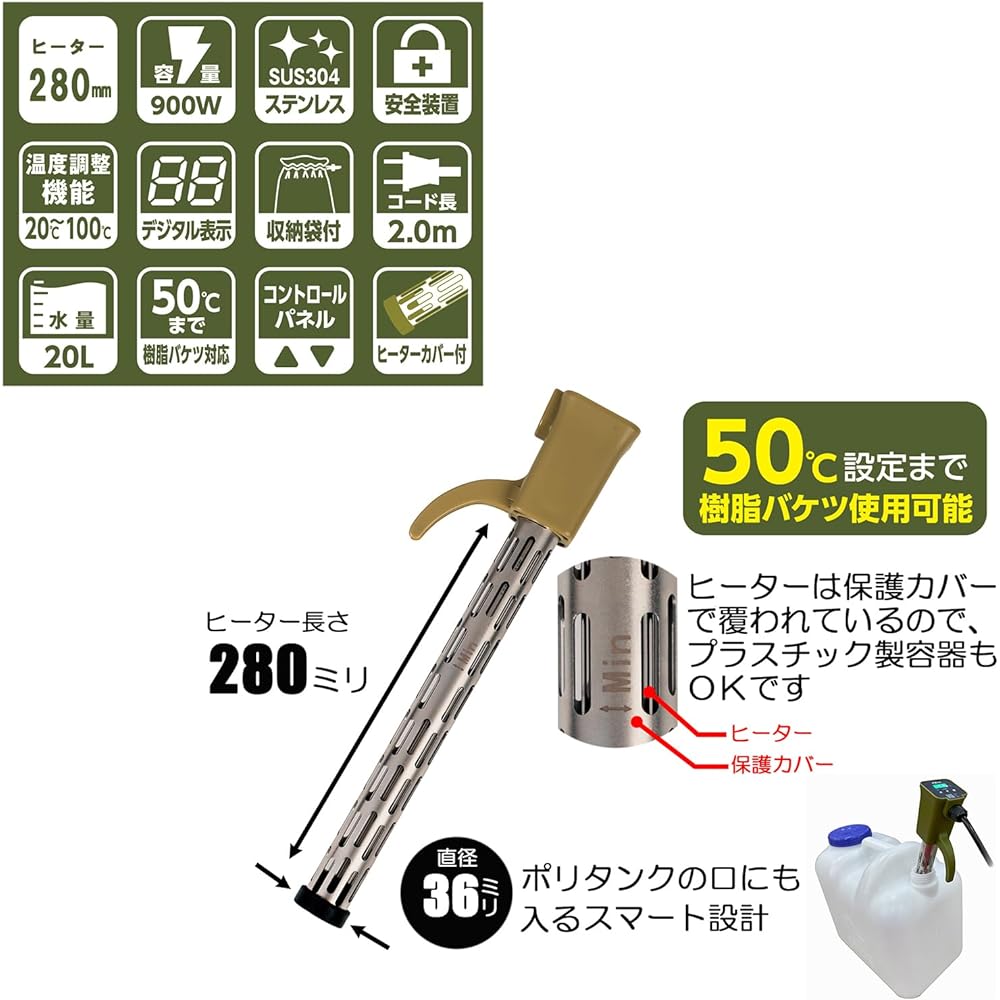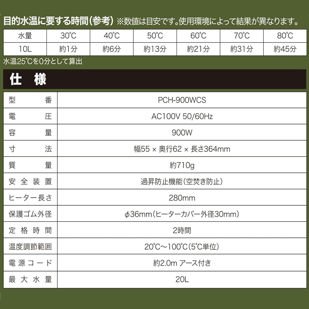 Rated voltage: AC100V (50/60Hz), Power consumption: 900W, Power cord: Approximately 2.0m ground wire included Rated time: 2 hours, Maximum water volume: 20L Temperature setting range: 20 degrees to 100 degrees (5 degrees increments) ) Compatible containers: iron buckets, resin buckets, poly tanks (temperature settings for resin buckets and poly tanks must be strictly below 50 degrees) Heater length: approx. 280 mm, protective rubber cap diameter: approx. φ36 (heater cover diameter approx. φ 30)