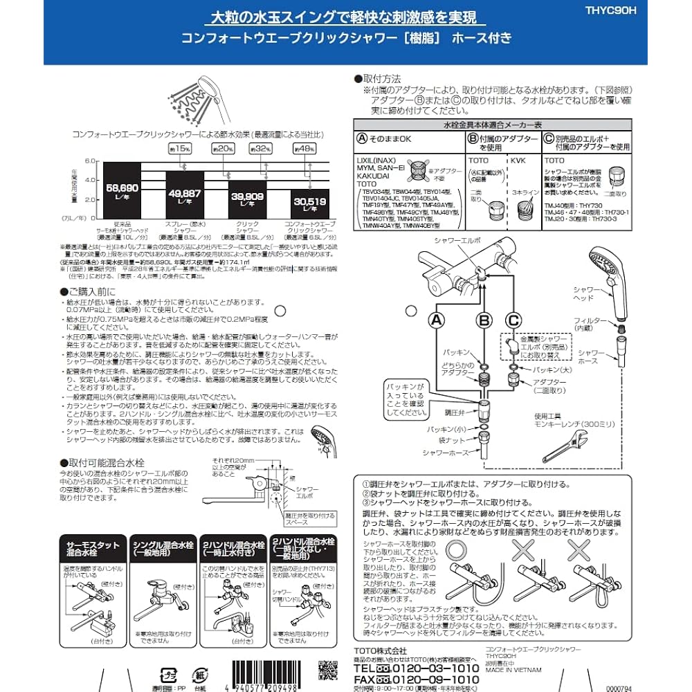 Set of Comfort Wave Click 90φ resin shower head + hose 1.6M (silver) + pressure regulating valve + adapter from other companies 48% water saving compared to TOTO conventional standard shower 2-handle mixer faucet without temporary water stop / single-lever mixer for cold regions Faucets and resin shower elbows cannot be attached to faucets.
