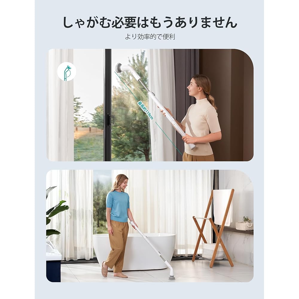 🧼 [Includes 4 types of replacement brushes and storage hooks] Bathroom, washroom, living room, dining room, study, kitchen, garden, backyard, garage, attic, balcony, storage, closet, laundry room, pool, etc. An electric mop that can efficiently clean more than 15 areas. The flat brush (large) is for cleaning flat surfaces such as floors, glass, bathroom doors, and mirrors; the dome-shaped brush is for cleaning wide curved surfaces such as bathtubs and sinks; and the square brush is for cleaning corners and narrow areas. The small brush is for cleaning hard-to-reach areas with grooves and crevices, such as drawers and corners; not recommended for car polishing and delicate resin products. 🧽【IPX8 Waterproof】IPX8 waterproof design allows the brush head to be safely used in wet environments. Note: Do not submerge the entire brush head in water. Remove the brush head and wash separately. 🧼 [Extendable & For Bathroom Cleaning] The HiCOZY electric rotary deck brush has an ergonomic design, and the extendable grip can extend up to approximately 119cm. No need to crouch down to clean hard-to-reach areas. 🧽【Long-term continuous use for 120 minutes & cordless design】The high-quality 2500mAh x 2 large capacity battery of the bath polisher can be used continuously for 120 minutes, allowing complete cleaning with a single charge. . Cordless design allows you to use it anywhere at home, anytime. 🧼【Two Rotation Modes】HiCOZY electric rotary bath polisher's powerful motor and high-quality brush provide 300 and 400RPM cleaning modes for thorough cleaning even in hard-to-reach crevices and corners. This powerful cleaner increases cleaning efficiency and ease, leaving your home clutter-free.