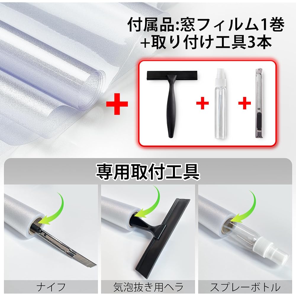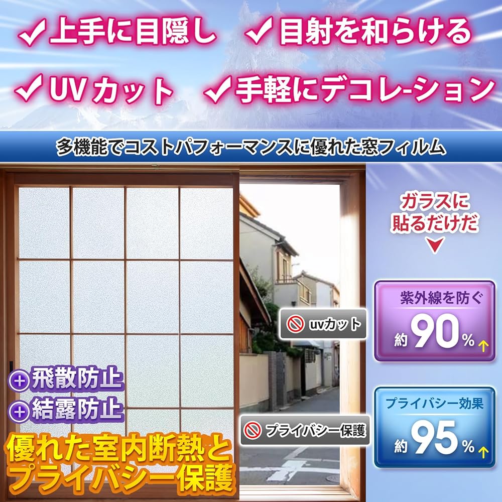 Frosted glass sheet [privacy protection/matte texture] Note: Free installation tools included! ! ! While blocking the view from outside, it allows plenty of light from outside to enter the room. The room will no longer feel dark, closed and crowded. A window blinding sheet that makes it difficult to see inside regardless of the weather or day or night if you are more than 20 cm away. We use high-quality materials and a durable window membrane that is resistant to discoloration. Made with a matte texture, it has a luxurious feel, and when applied, the glass becomes matte glass, making it suitable for many scenes such as bedrooms, bathrooms, and kitchens. UV protection film [Adjusts light rays and cuts UV rays] While blocking the view from outside, it allows enough light from outside to enter the room. The room will no longer feel dark, closed and crowded. It blocks a lot of harmful UV rays from entering the room through the glass. Protects furniture and flooring from fading due to UV rays. Prevents flooring materials such as flooring, tatami mats, and carpets, as well as indoor furniture and furnishings, from sunburn and deterioration caused by ultraviolet rays. Glass Shatter Prevention Film [Glass Shatter Prevention/Glass Scratch Prevention] After the pasting operation is completed, the adhesive strength is restored as it is an electrostatic adsorption type, so even if the glass breaks during a typhoon or earthquake, the glass fragments will not scatter! This can prevent secondary disasters and unexpected damage caused by debris. It can also prevent accidental scratches on the glass surface. Window blindfold film [Easy to use and reusable] Just peel off the transparent protective film and apply with water, no adhesive is required, and it can be used repeatedly without leaving any traces on the glass. Easy to use even for beginners. It can be cut to the required size depending on the size of the glass, making it easy to attach to any size glass. (Be sure to remove the protective film. If you do not follow this procedure, the attached glass film will peel off.) Insulation sheet window [Energy saving and air conditioner efficiency increase] Create a comfortable indoor space and absorb outdoor heat. It blocks (heat shielding effect), blocks solar heat, and suppresses the inflow of hot air when using an air conditioner, increasing cooling efficiency. Electricity costs are lower and efficiency is slightly higher. Helps save on electricity bills. In the summer, it cuts over 85% of infrared rays, greatly reducing the intrusion of solar heat. Improves efficiency of cooling and heating. In the summer, it is effective in suppressing the heat entering the room and keeping the room temperature cool with the air conditioner. In winter, it prevents indoor heating from escaping and prevents cold air from entering from outside. This is a great value item that can be used in all seasons.