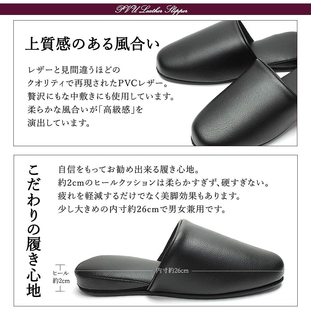 [HYBRIDWORKS] 3-pair set, high quality leather style slippers, antibacterial, black, approx. 26cm, unisex, wipeable, for guests, for business use, front closure