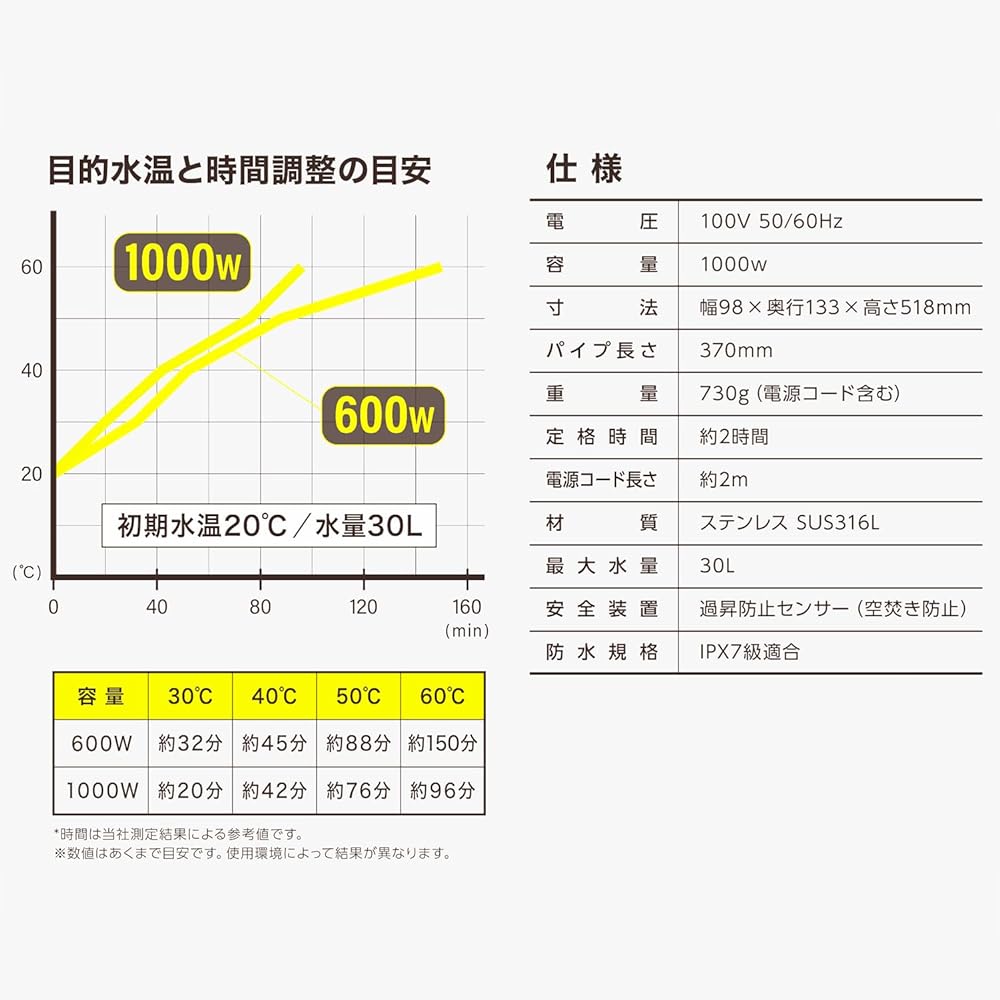 Safe and secure bucket heater with sensor to prevent overheating [Applications] Electric heater that heats water in buckets for interior design, civil engineering and construction sites, outdoor leisure, etc. [Features] - Overheating prevention sensor that turns off the power when the temperature exceeds a certain level. - The three legs prevent the heater from touching the bottom of the bucket, increasing the stability inside the bucket. - The pipe part is made of stainless steel and is rust resistant, making it easy to clean and store. , The highest water level line is marked on the main pipe, so there is no need to worry about it disappearing or coming off. - The hook part is movable, so it can be adjusted according to the size of the bucket. [Notes] *In the product package Please be sure to read the "Safety Precautions" listed and use the product correctly. *Please do not disassemble, repair or modify this product unless you are a repair technician. *Do not use in areas with gunpowder, volatile flammable materials, or flammable materials. *Do not allow children to use it or use it within the reach of young children. *Please use a separate AC 100V outlet. *It may cause fire or electric shock. *Be sure to unplug the plug from the outlet when not in use. *Please connect the ground wire to the ground terminal to ground. *Be sure to turn on the heater underwater. *If the bucket container falls over during use, immediately unplug the plug from the outlet and stop using it. *When taking the heater out of the water, pull out the plug and wait for the heater to cool down sufficiently. *Do not damage, damage, modify, forcibly bend, pull, twist, or bundle the power cord. *Do not use to heat anything other than water. *Do not use water other than tap water or well water (seawater, rainwater, etc.). *Do not put the mold part in water. *Do not use for overheating a bath. *Please do not empty the fire. *Do not use below the minimum water level. *Do not use in resin containers. *Do not touch the heater during or after use. *Also, do not place it on top of flammable materials. *Please keep an eye on it while using it.