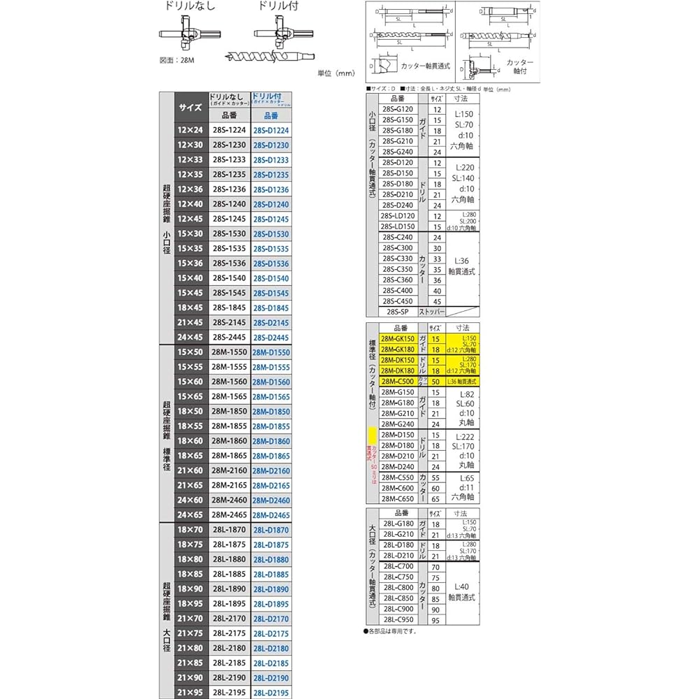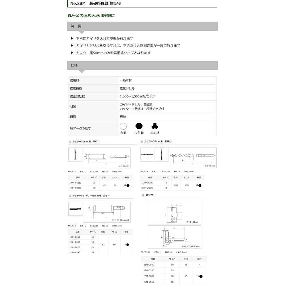 A special drill for spot boring for embedding bolt heads, nuts, washers, etc. [Applications] Spot boring for embedding bolts, nuts, washers, etc. [Features] - Suitable for spot boring for round washers and square washers - Pilot hole By inserting a guide into the cutter, you can easily counterbore. - By setting the included drill in the cutter, you can perform counterboring and pilot hole drilling at the same time. - Three different blades reduce cutting resistance. - Excellent power for firing. [Precautions] *Please use with power tools that operate at 1000 to 1500 revolutions per minute or less. ●Special drilling hole for embedding bolts, nuts, washers, etc.