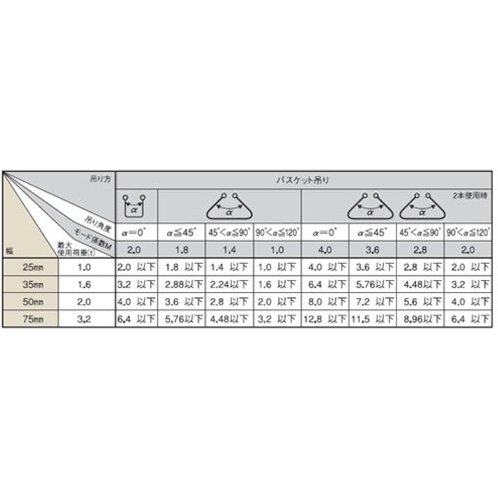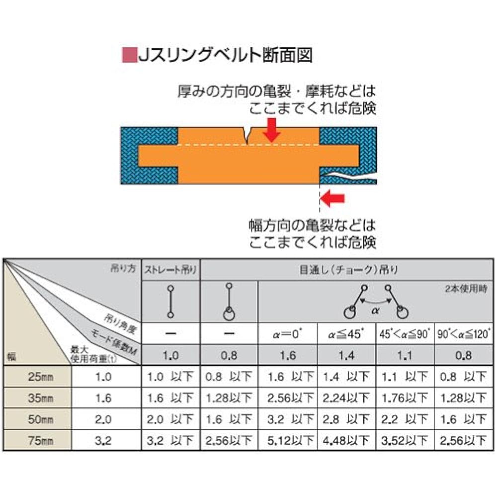 Even stronger type JIS standard top grade product J sling belt eye-shaped on both ends (with tough protective sheet on the hanging part) [Features] ●Super strong JIS grade standard product (superlative) ●Super strong polyester ●Informs the usage limit If cracks or wear occur up to the blue lines on both ends, it is a danger signal. ●We can produce the desired length. ●Low elasticity allows stable work even with heavy objects. [Specifications] ●Width: 75mm ●Length: 2.0m ●Maximum working load: 3.2t *Toyo's sling belt has a sufficient safety factor, but please do not hang it above the maximum working load. *Please refer to the working load table depending on the hanging angle before use. ● JISIV grade standard product (highest grade) ● Uses polyester fiber ● If cracks or friction occur up to the black lines at both ends that indicate the usage limit, it is a danger signal
