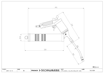 ●Nozzle connection screw: R1/8●Air pressure used: 0.4~0.8MPa●Applicable grease: Consistency No.0, No.1●Grease up the machine. ●For air only. ●Since the gun rotates 360°, the angle can be adjusted depending on the location. ●Since it can discharge grease continuously, it is ideal for applying large amounts of grease. ●Grease is for cartridge use only. ●For air only. The gun rotates 360 degrees, so you can adjust the angle depending on the location. Continuous discharge of grease is possible, making it ideal for applying large amounts of grease. Grease is only for cartridges