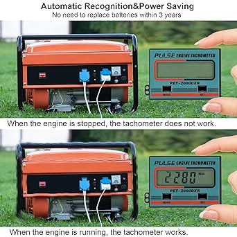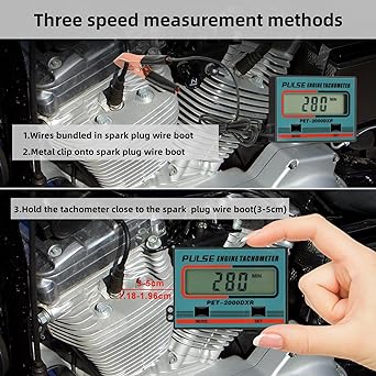 1. [2-stroke/4-stroke] - This product is designed to measure the rotational speed (RPM) of a 2-stroke or 4-stroke fuel or gasoline engine, timing accumulation when the engine runs up to 8 cylinders, and other unique Suitable for measuring functional design. 2. [Energy saving, power saving, convenient and practical] - After the gasoline engine stops working, the tachometer will automatically save energy and power and automatically turn off the display. The tachometer will automatically start testing when the gasoline engine is running. 3. LCD display Low voltage design Built-in button power method Inductive design Safe and reliable 4. [Multiple measurement methods] - Attach one end of the electronic wire to the electronic meter, and measure inductively with a metal clip on the spark plug wire sheath. 5. Applications - Gasoline (engines, chainsaws, lawn mowers, gliders, motorcycles, cars, go-karts, construction vehicles, snowmobiles, beach bikes, motorboats, shredders, generators, vibrators) machinery and equipment, etc.