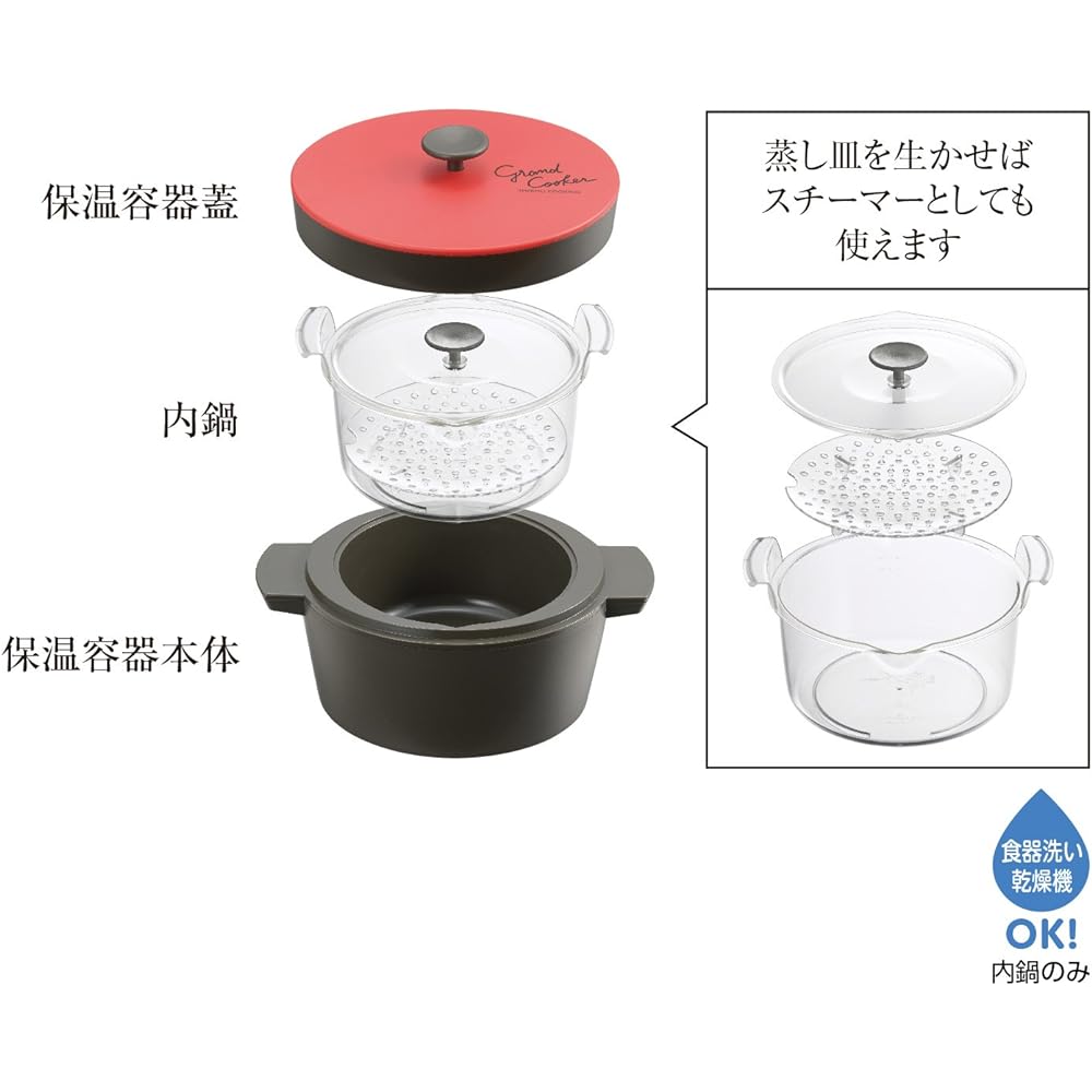●Put the ingredients in the inner pot and heat in the microwave!All you have to do is set it in a heat insulating container and let it simmer in the residual heat, so there will be no burning or simmering, and the flavor will soak in slowly.● Comes with a steaming plate that expands the range of cooking ●Product size: Actual item (thermal cooking container) approx. 30 x 22 x 18cm, (inner pot) approx. 21.5 x 19 x 11cm ●Product materials: Insulating cooking container = polypropylene, styrofoam, stainless steel, inner Pot = polymethylpentene/polypropylene ● Product contents Pot capacity = approx. 1.65 liters Steaming plate, recipe included ● Microwave x Keep warm = Easy, safe, and delicious ● Just put the microwaved ingredients in a heat insulating container and use the fire. Full-fledged heat-retaining cooking without any hassle ● Washable thermal container, transparent inner pot that allows you to see the contents while cooking in the microwave ● Comes with a dedicated recipe book ● Manufactured in Niigata, where molding, manufacturing, processing, and packaging are all done at our own factory. Akebono Sangyo in Tsubame City