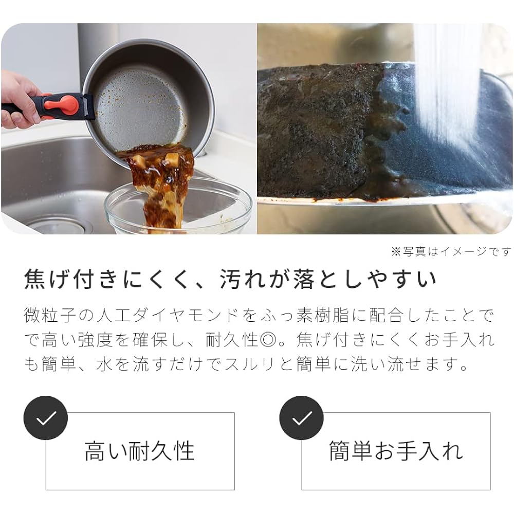 [Product specifications] Size: 20cm deep pan/maximum inner diameter 20cm, depth 7cm, bottom thickness 3.5mm (including beam bottom), weight 480g/24cm frying pan/maximum inner diameter 24cm, depth 4.7cm, bottom Thickness: 3.5 mm (including beam bottom), weight: 650 g, Materials: Main body/aluminum alloy, beam bottom/stainless steel (16% chromium), handle/phenolic resin, bottom surface treatment: inner surface/fluorine resin coating, outer surface /Ceramic coating processing, Set contents: 20cm deep pan, 24cm frying pan, removable handle, Usable heat sources: Household gas stove, radiant heater, halogen heater, enclosure heater, sheathed heater, electromagnetic cooker IH cooking heater (100/200V) Compatible) [2 types of frying pans & 3 convenient handles] Standard and easy-to-use 24cm deep pan with a depth of approximately 7cm, convenient for stewing and frying. [Removable handle for convenient storage] With the use of a removable handle, it can be stacked for compact storage. If you remove the handle, you can further expand your cooking options. [Diamond Coat Processing] The fluororesin coating containing artificial diamonds prevents food from sticking, making it easy to clean! Also, since it is non-stick, you can cook with less oil, making it healthy and economical. It also has high wear resistance and durability. It can be easily washed off by simply running water. [Bottom thickness 3.5cm] Thick wall has excellent heat retention and heat storage, and has good thermal conductivity. You can cook delicious food by keeping the entire bottom surface at a uniform temperature. Coated with "Silkware" by Daikin Industries, Ltd. In addition, it is resistant to abrasion due to its "multi-layer coating" with 3 layers on the inside and 2 layers on the outside. Cleared abrasion resistance test 1 million times.