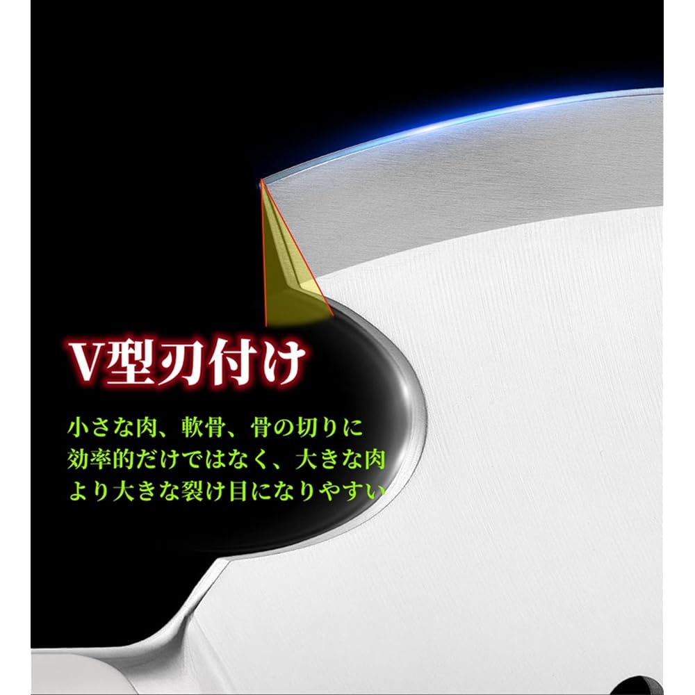 [Specifications] Product name: White handle, ax-shaped bone cutting knife. Size: Blade length 123mm/Total length 258mm/Handle length 135mm/Blade width 129mm/Blade thickness 3.5mm. Material: Blade material 5Cr15MoV stainless steel/hardness 57±2HRC/handle material ABS resin, weight 465g. [Application] A bone cutting knife mainly used for cutting bones in poultry, fish, etc. The blade is large, heavy, and sharp, so it can efficiently cut not only hard ingredients such as chicken and fish bones, but also thick meat and bones. [High-carbon steel blade] This ax-shaped steel knife is made of 5Cr15 MoV stainless steel that is resistant to rust, corrosive acids, and stains, and maintains its sharpness with easy maintenance. With a V-shaped blade that cuts well when finishing bone chops, it is not only efficient for cutting small pieces of meat, cartilage, and bones, but large pieces of meat are prone to larger tears. [ABS resin handle] The connection between the stainless steel blade and ABS resin handle has a base, and there is almost no gap, which prevents bacteria from entering and multiplying, and can be sterilized with boiling water, making it hygienic. The handle fits comfortably in your hand, and is less slippery than a stainless steel handle, so it won't get cold when you hold it in the winter. [Easy Maintenance] Dishwasher safe. The circular blade prevents your hands from being injured when washing hands, and after maintenance, you can use the hole in the blade to store it.