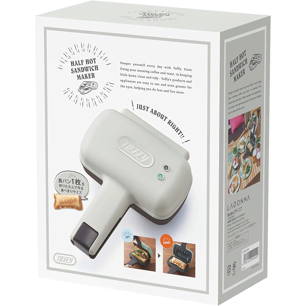 An electric hot sandwich maker that can make "half hot sandwiches" by folding a single piece of bread. Just place the bread and add your favorite toppings to create a half-hot sandwich in no time. Great for everyday breakfast, as well as lunch and cafe time on holidays! “Half hot sandwich” that is just the right size! “Half hot sandwiches” are made by folding a single piece of bread, and are low in calories and are perfect for women and children. It's half the size of a regular hot sandwich, so you can enjoy the perfect amount as a snack. Just place the bread and add your favorite ingredients! A piping hot sandwich is ready in about 4 minutes. *Suitable bread size: 8 to 12 slices. From standard hot sandwiches such as ham and cheese, you can add a variety of ingredients to create a rich variety! It can be enjoyed in a variety of situations, including daily breakfast, cafe time, and holiday brunch. Nice compact size! It can be placed upright, making it easy to store. It is also recommended for those who live alone. ■■Toffy_Classic Series■■ The slightly retro and familiar design is attractive. This classic line is popular for its simple, easy-to-handle specs and dusty color.