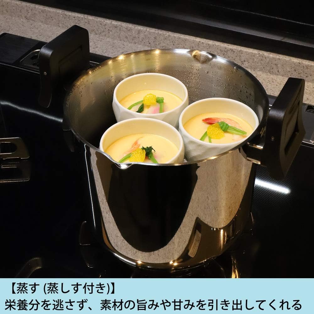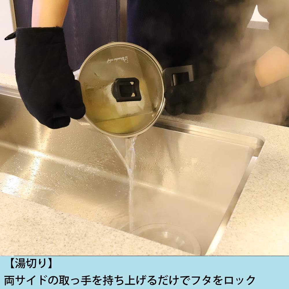 Size (approx.): External dimensions/28 x 22 x 23 cm, internal dimensions/Diameter 20 x 17 cm Materials: Stainless steel (18% chrome, 8% nickel), pasted bottom/aluminum/stainless steel (chrome 18) %・Outside thickness of bottom center recess 3.0mm), handle/glass lid knob/phenol resin, lid/fully physically tempered glass Country of production: China, planning design: Japan Full water capacity: approx. 5.3L Accessories: Instruction manual, Steamer Just lift the handle to lock the lid and drain the hot water.This one unit can be used for boiling, steaming, and boiling. Wonder Chef's multi-purpose deep pot that can be used in a variety of ways.You can place kitchen tools such as a ladle and chopsticks on the lid knob.