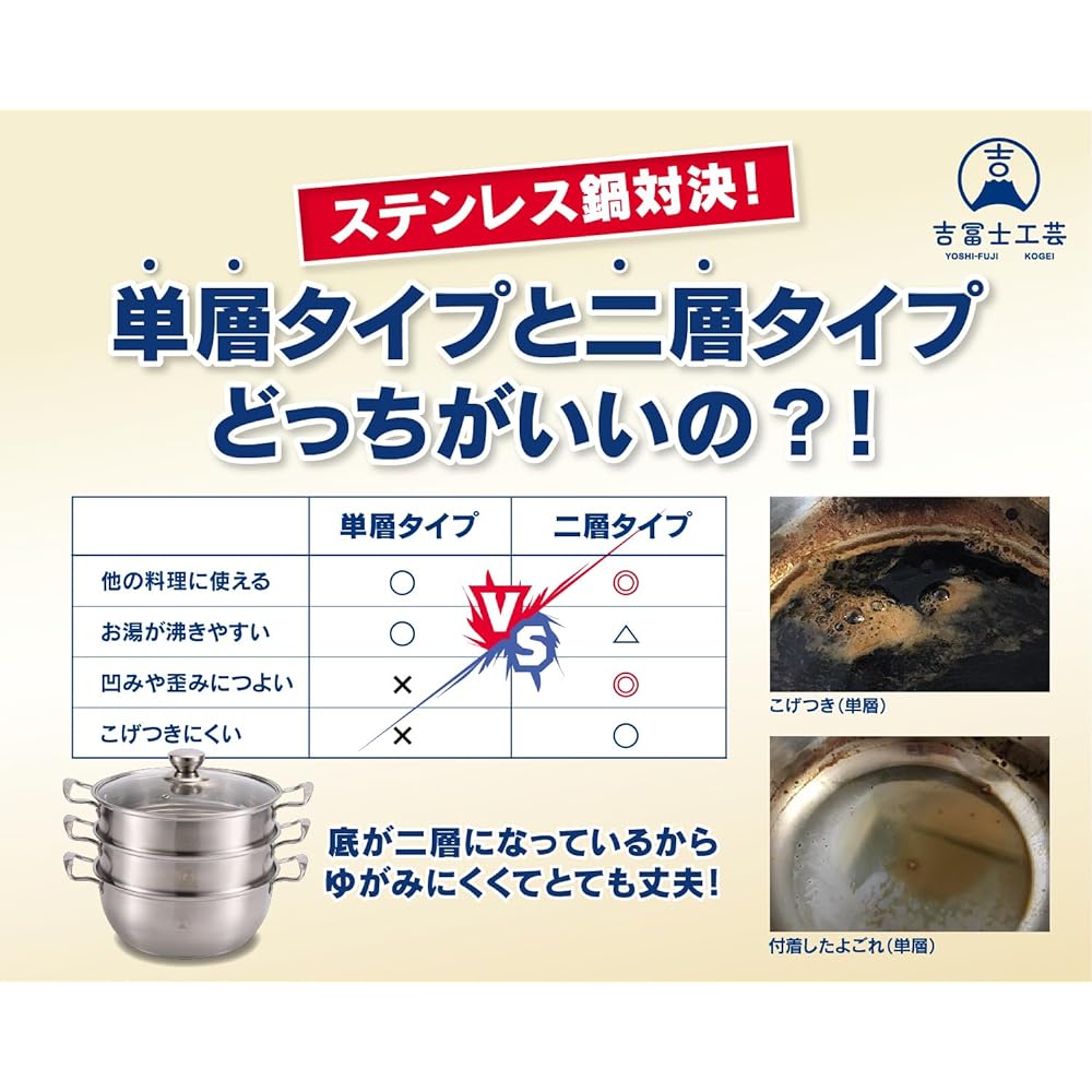 Yoshifuji Crafts Steamer, 26cm, 3-tier set, with glass lid, IH compatible, stainless steel steamer pot, 2-layer bottom to prevent deformation, double-handed pot that can also be used for oden and hot pot dishes (3-tier set)