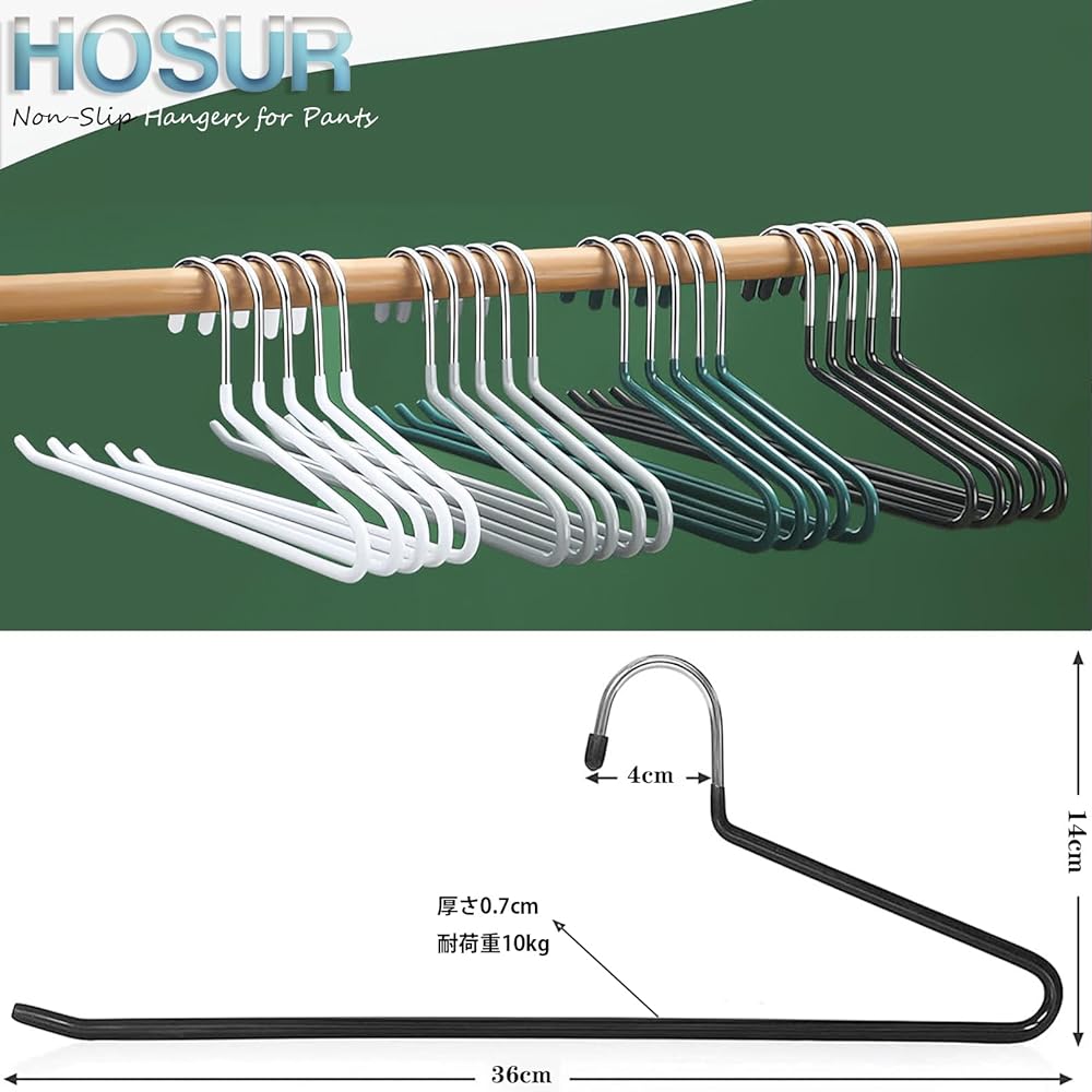 [Easy to use & prevents wrinkles] One side of the pants hanger is open, so you can hang and remove pants smoothly from the side. The main body has a rounded design, so it won't wrinkle easily when hung. Even skirts with pleats are safe. [Non-slip] The steel hanger body is specially coated with PVC resin, so the clothes you hang will not slip off. Convenient for storing not only pants and skirts, but also small items such as mufflers, scarves, and ties. [Excellent Durability] The hanger body is made of sturdy steel and is plated to resist rust and scratches, making it extremely durable. Also, unlike plastic, it does not easily deform, so you can use it for a long time. It's thin and light, but you can wear it with long winter stoles or heavy jeans and it won't fall off and stays neatly organized. This is a high quality hanger that will last a long time. [Neat storage] The thickness is only about 0.7 cm, so it does not take up much space in your closet. By unifying the hangers, it looks beautiful and can be stored neatly. [Double use for washing and storage] It can also be used for washing, and once it is dry, it can be placed directly in the closet. Since you don't have to fold it up, you can also save time in taking it in. Since it is made of special PVC resin material, it is safe even if it gets wet.