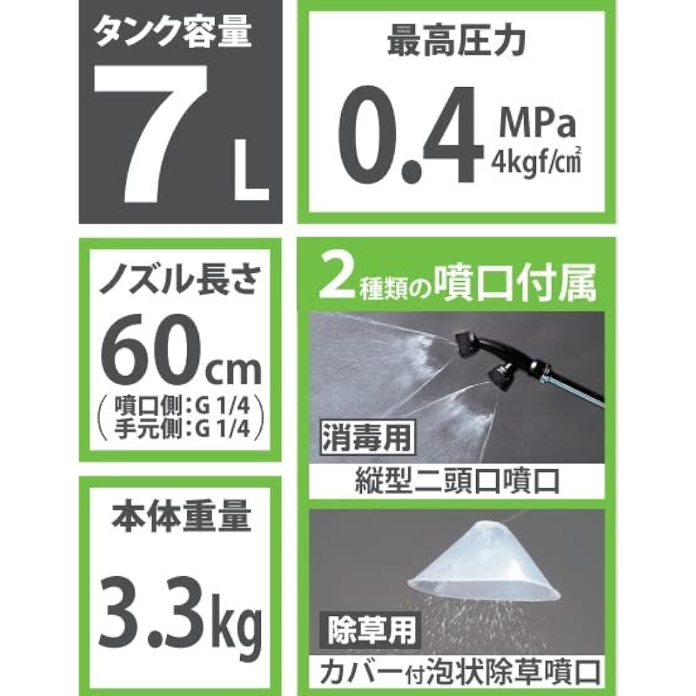 1. Introducing the 7L type manual sprayer that you can carry on your back! 2. Lightweight at 3.3kg, making it easy to work for long periods of time! Weeding spout with cover included as standard Nozzle specifications: Nozzle pipe 60cm, hose 1.2m, spout connection G1/4, nozzle pipe connection G1/4 Pump type: Diaphragm pump Maximum pressure at closing 0.4Mpa Accessories: Flexible double-head spout, with cover Weeding spout, nozzle pipe, measuring cup weight: 3.3kg