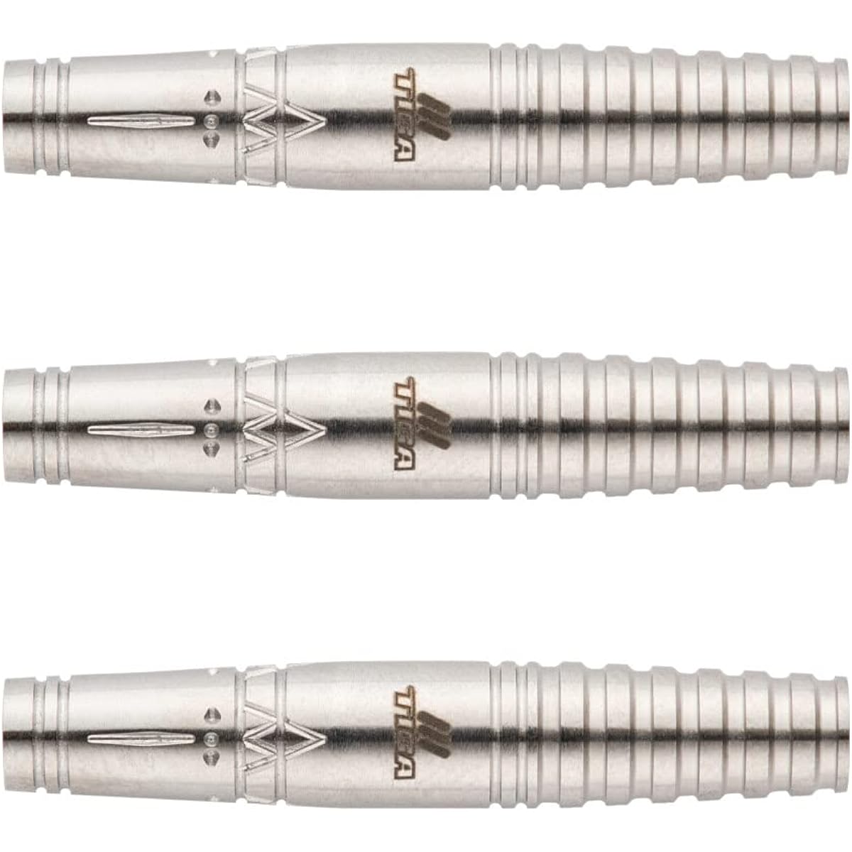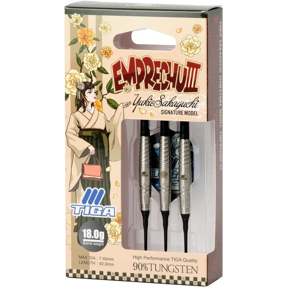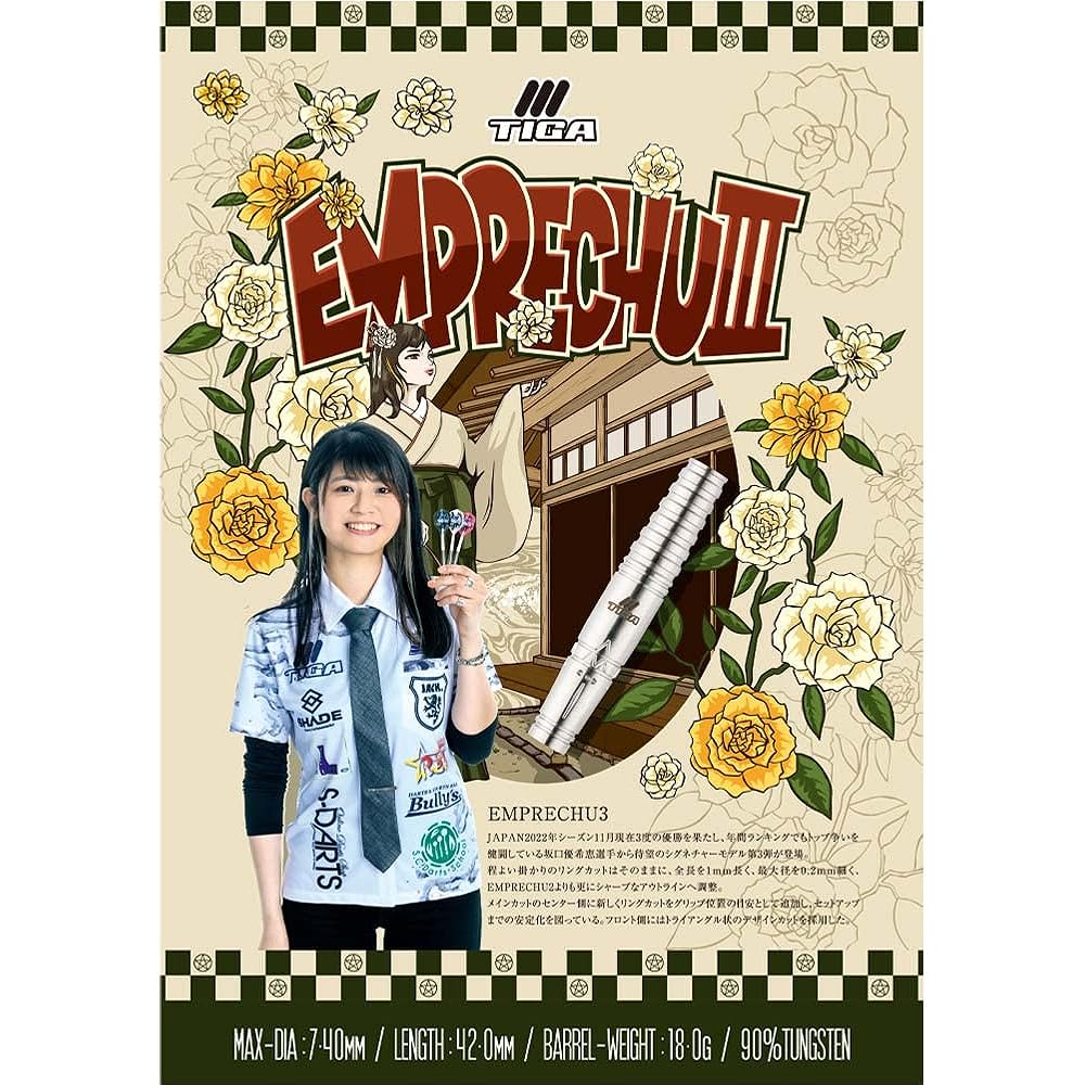 ■Product specifications Material: Tungsten 90% Total length: 42.0mm Maximum diameter: 7.4mm Barrel weight: 18.0g Shape: Torpedo Notch: Ring cut, vertical cut Standard: 2BA ■ TIGA EMPRECHU 3 Yukie Sakaguchi ModelJAPAN2022 season The long-awaited third signature model from Yukie Sakaguchi, who has won three championships as of November and is fighting for the top in the annual rankings, is now available. While maintaining the moderate ring cut, the overall length is 1mm longer, the maximum diameter is 0.2mm thinner, and the outline has been adjusted to be even sharper than EMPRECHU2. A new ring cut has been added to the center side of the main cut as a guide to the grip position to stabilize the setup. A triangular design cut is used on the front side. ■Specification Material: Tungsten 90% Total length: 42.0mm Maximum diameter: 7.4mm Barrel weight: 18.0g Standard: 2BA ■Contents Barrel x 3 (1 set) Flight x 3 (1 set) Shaft x 3 (1 set) Tip x 3 (1 set) Safety Warning This product is safe.