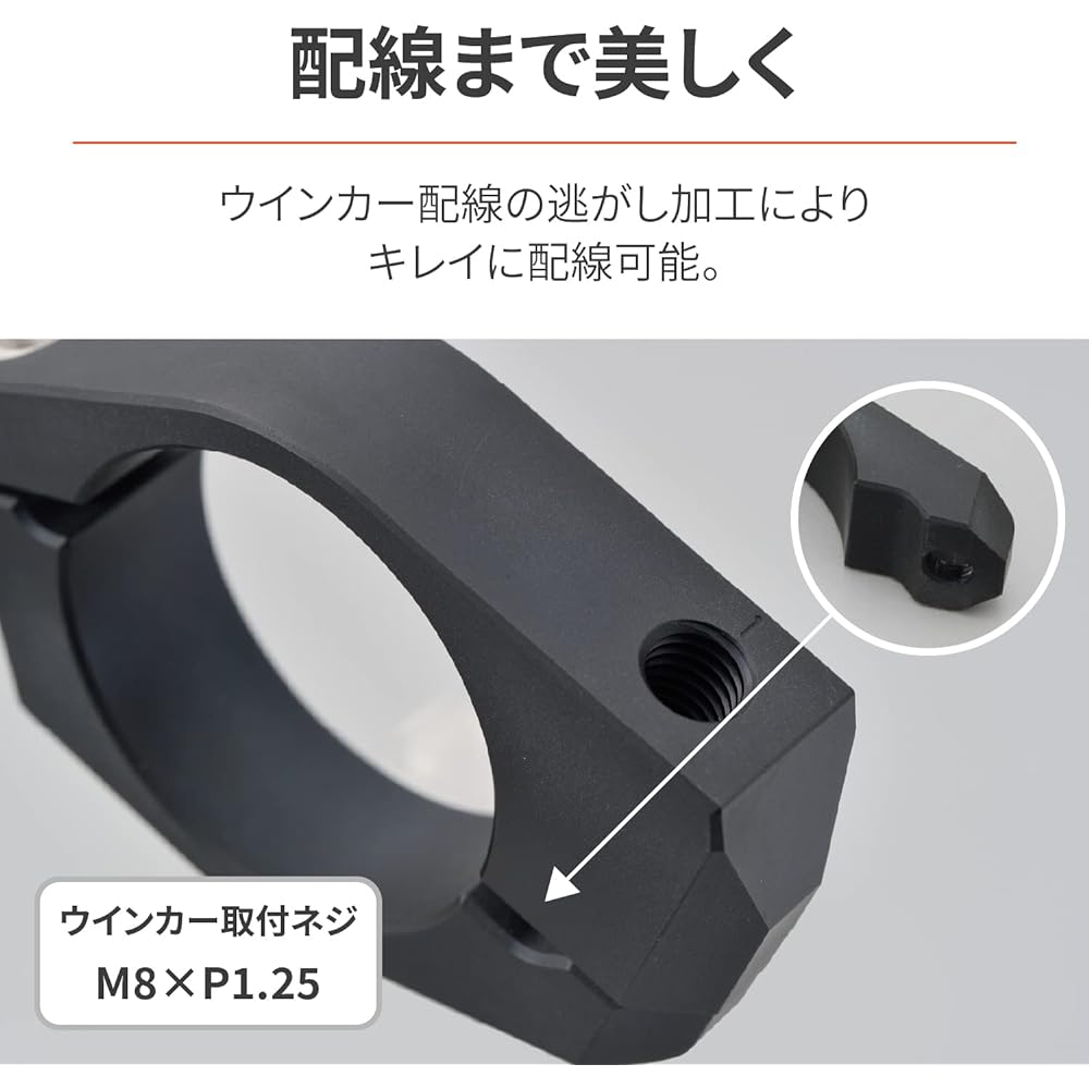 The 2-piece structure allows installation without removing the front fork. Turn signal bracket made of machined aluminum. You can install turn signals with M8 x P1.25 mounting screws such as Daytona's D-Light and HIGHSIDER. Furthermore, with the D-Light turn signal series, you can install it with the included special nut. * Turn signals with M10 mounting threads cannot be installed. *The front fork inner tube may be damaged after installation. *The included special nut is only for Daytona's LED turn signal D-Light series. If you are installing something other than the D-Light series, please use the nut that comes with the turn signal. *Wires with terminals cannot be passed through the turn signal M8 bolt mounting part.