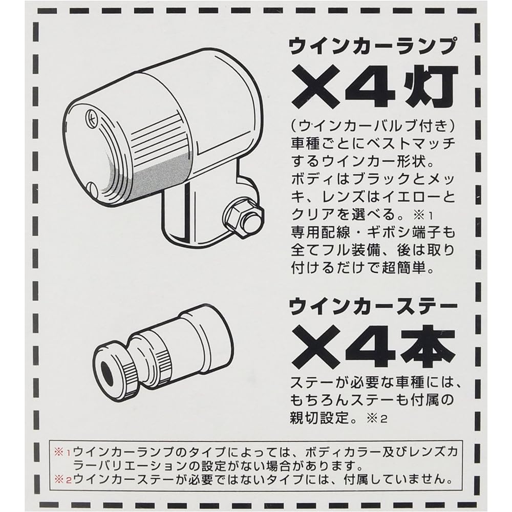Easy dress-up parts, turn signal KIT. Since it is set specifically for the vehicle model, there is no need to make bullet terminals, process stays, or purchase additional wiring. Completely bolt-on and can be installed immediately.