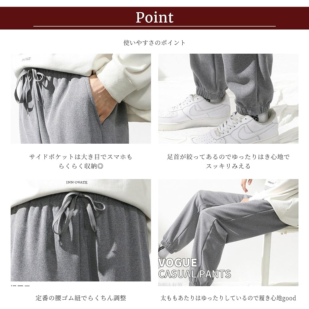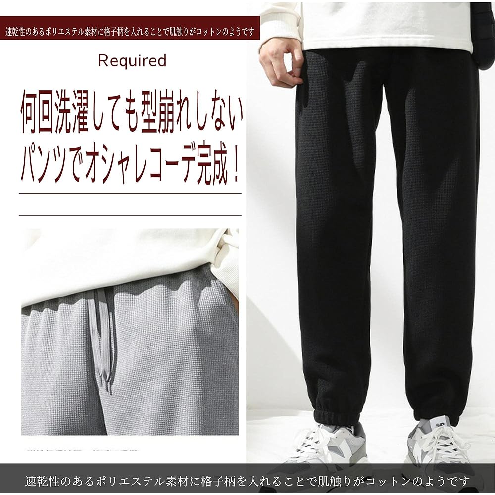 By using waffle fabric for the pants, we have achieved a smooth feel and quick drying. This is a super easy-to-use model with a tapered silhouette that narrows towards the hem. It has a sporty look and can be worn outdoors or casually.