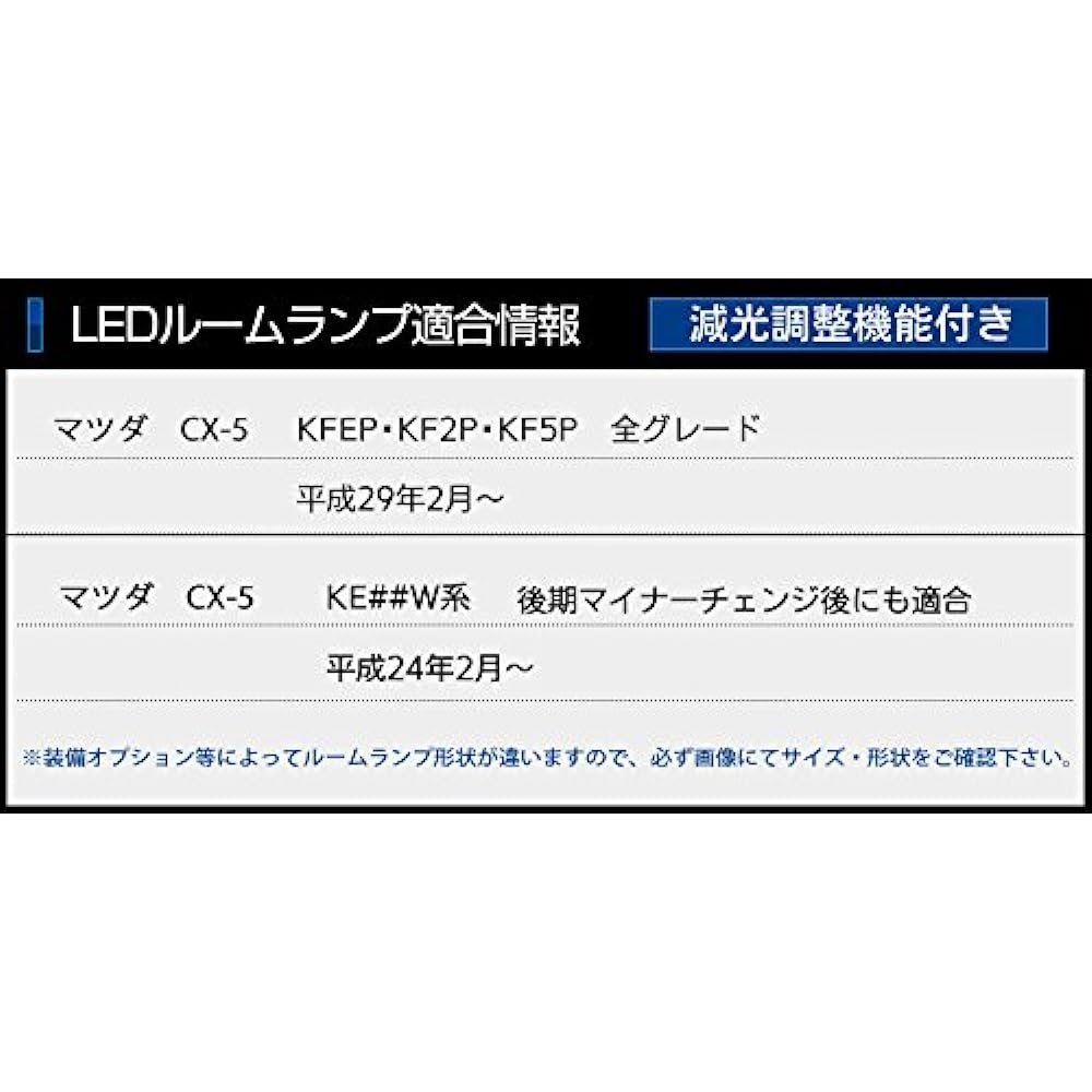 ◆Compatible model CX-5 KFEP KF2P KF5P KE##W series All grades February 2016 - February 2012 February 2011 - Late model Compatible with minor changes ◆ Please note: Missing parts depending on grade, options, model year, etc. There are also non-conforming pieces. Please be sure to check the product in the image and the shape of the interior lamp of your vehicle before purchasing. Some vehicles may have a weak light on even after the light has been turned off. ◆Precautions for use The LED has polarity, so if it does not light up, please insert it in the opposite direction. Due to low power consumption, a bulb burnout warning light may come on depending on some vehicles. ◆Warranty Warranty period: 1 year after arrival Initial failure response period: 1 week Installation should be done by a professional or dealer. If you install it yourself, it may not be covered by the warranty. Please note. The warranty is only for the product, and we will not be responsible for any costs such as labor costs for replacement etc. Please note that this warranty only covers natural breakdowns, and may not be covered depending on the reason for the breakdown. Initial (within 7 days after arrival) shipping charges for exchanges other than defects will be borne by the customer. Caution (Disclaimer) > Please read Warranty period: 1 year Initial failure response period: 1 week *Please install by a professional or dealer. If you install it yourself, it may not be covered by the warranty. Please note. Also, only malfunctions under normal usage are covered by the warranty. Please note that under no circumstances will we provide warranty for the vehicle or labor charges.