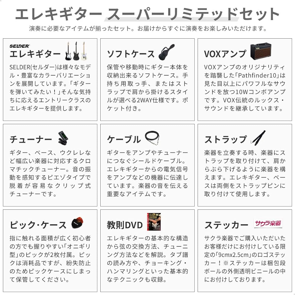 SELDER custom model "black matte specification" A jet black electric guitar with a completely black finish, including the body, pickguard, matching head, and hardware.The included amplifier is a VOX "Pathfinder 10". This is a 10W combo amp that emits a more powerful sound than it looks. [Set contents] Electric guitar body (adjustment hex wrench included), Soft case for body, VOX amplifier (Pathfinder 10), Shield cable, Strap, 2 picks, Pick case, Tuner, Instructional DVD, Sakura musical instrument sticker *Click here The product is an "electric guitar" with 6 strings. *Set accessories may differ in appearance and specifications depending on production time and stock status. Thank you for your understanding.