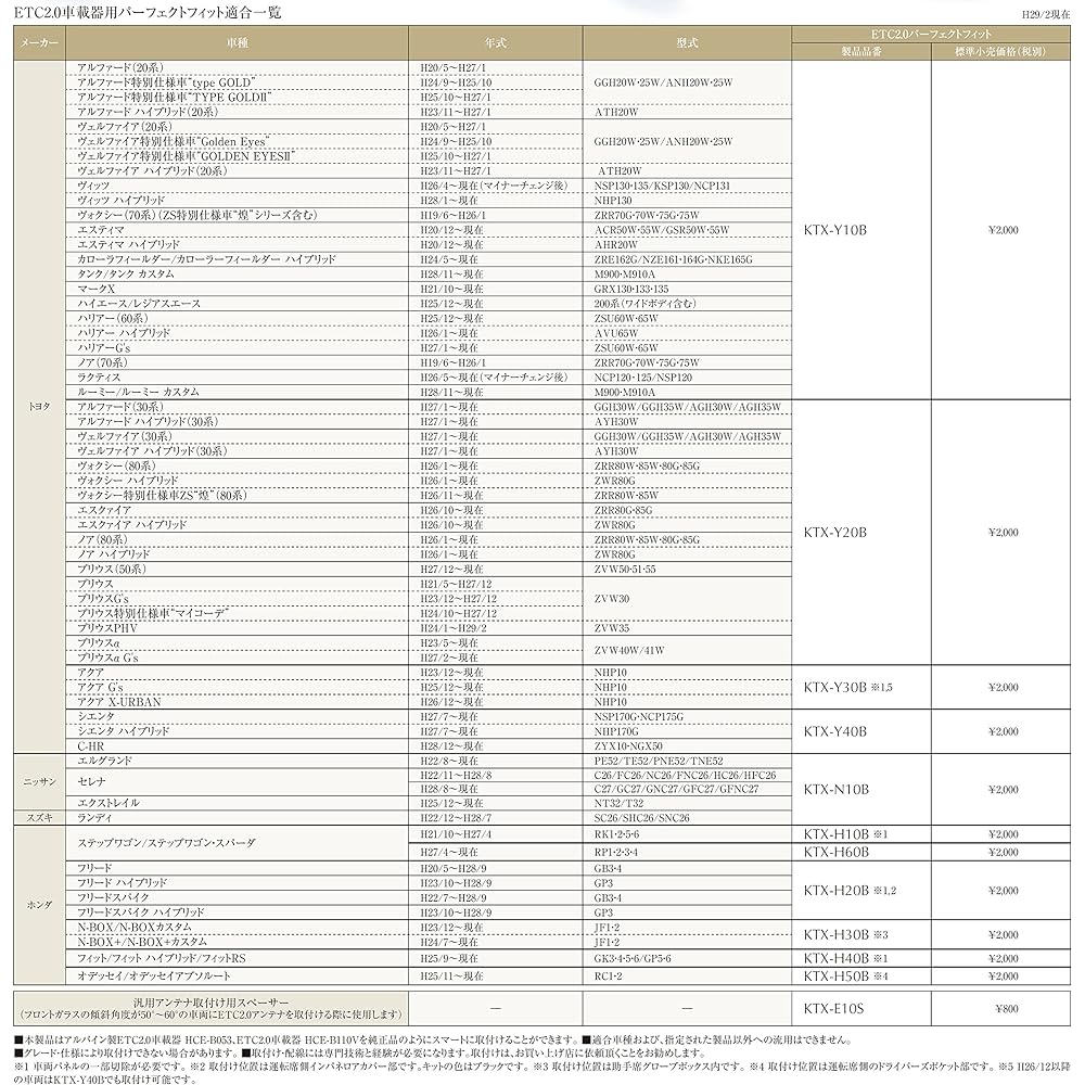 ETC onboard equipment, 2-piece set of parts specifically for built-in vehicles. HCE-B110V comes with a VICS optical beacon antenna. The ETC onboard device is also equipped with driving support and road traffic information provision functions. Compatible with HCE-B110V and HCE-B053 installation. KTX-Y20B and KTX-Y10B are compatible with Toyota vehicles, and KTX-N10B is compatible with Nissan vehicles.