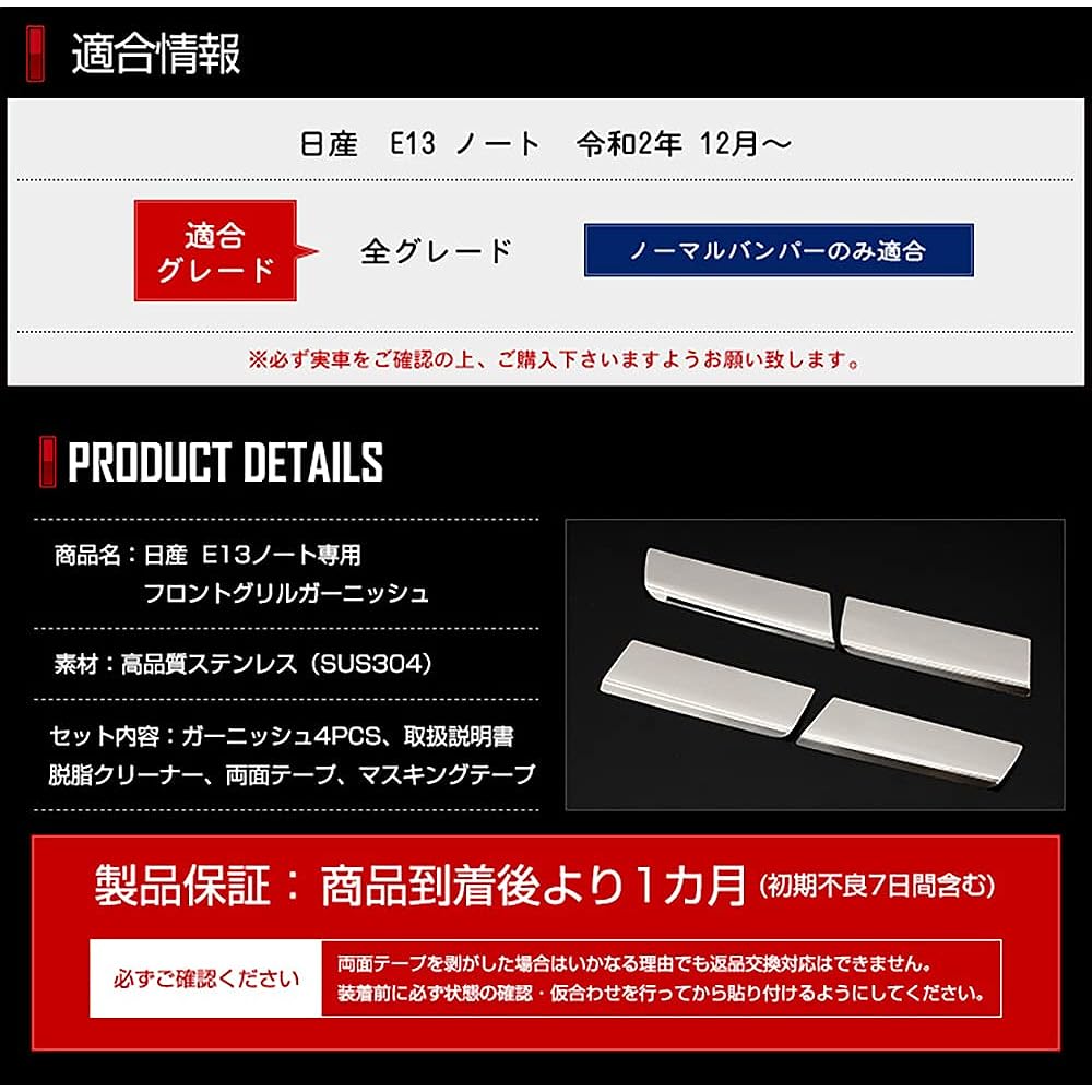Compatible models: Nissan E13 Note December 2020 - Compatible grades: All grades * Only compatible with normal bumpers Accessories: Instruction manual included, degreasing cleaner, masking tape, double-sided tape Material: High quality stainless steel Warranty period: One month from arrival of the product [including 7 days for initial defects]
