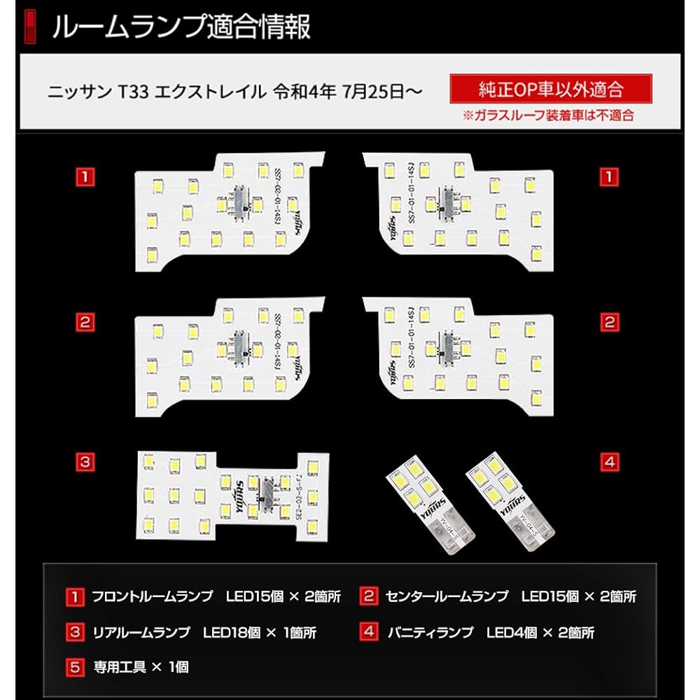 Compatible models: Nissan X-Trail T33 series from July 2020 Compatible grades: Compatible with all grades [Excluding genuine OP and glass roof equipped vehicles] Set contents: Front room lamp x 2, center room lamp x 2, Rear room lamp x 1, vanity lamp x 2, special tool LED color: White (pure white equivalent to 5500 to 6000 Kelvin) Warranty period: 1 year from the date of product arrival [including 7 days of initial defects]
