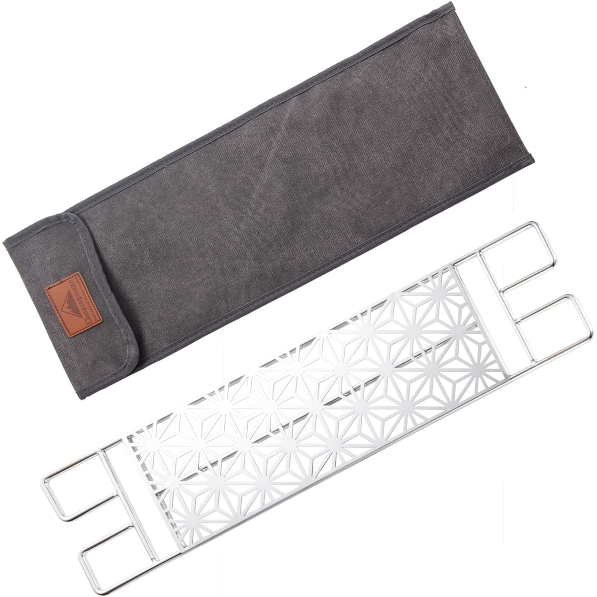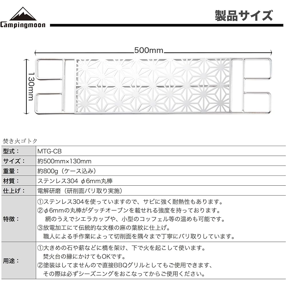 Total weight: Approximately 800g (including case) Size: Approximately 500mm x 130mm Material: SUS304 φ6 round bar, canvas Finishing: Electrolytic polishing (ground surface deburred) Features: ① Made of stainless steel 304, so it will not rust. It is also strong and heat resistant. ②The round bar with a diameter of 6 mm is strong enough to hold a Dutch oven. You can also warm Sierra cups, small coffels, etc. on the net. ③ Finished with a traditional hemp leaf pattern using electrical discharge machining.